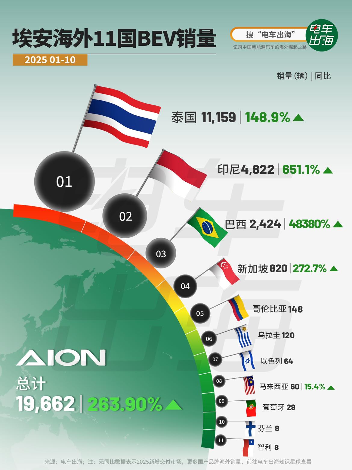 今年1–10月,埃安在海外的纯电表现可以说是意外抢眼。 11个市场累计19,662辆,同比接近三倍的提升,已经让它从一众新势力的海外名单里跳了出来。 泰国依旧是支撑盘,超过1.1万辆的体量,放在当地已经能和主流合资品牌直接对线,印尼的4,822辆同样猛烈,让埃安在东南亚形成了第二个可靠的发力点。 如果说东南亚的爆发还算在预期里,那么巴西的变化多少有点“跳级”,从去年5辆到今年2,424辆,这已经不是试水,而是真正进入到稳定运营阶段。 再配上新加坡、马来西亚、以色列、乌拉圭等多地的同步起量,埃安的版图正在从东南亚往南美、中东以及部分欧洲边缘市场扩散。 背后的逻辑其实很清楚:价格竞争力够强,产品序列覆盖面广,补能体系不需要重资产投入,再加上在右舵市场的适配性本来就不错,这些都让埃安在新兴市场的落地速度非常快。 从目前的规模来看,埃安已经不再处于“摸路子”的阶段,而是开始以真正的量级在海外做布局。如果接下来欧洲那边的节奏继续推进,它的全球存在感会进一步被推高。