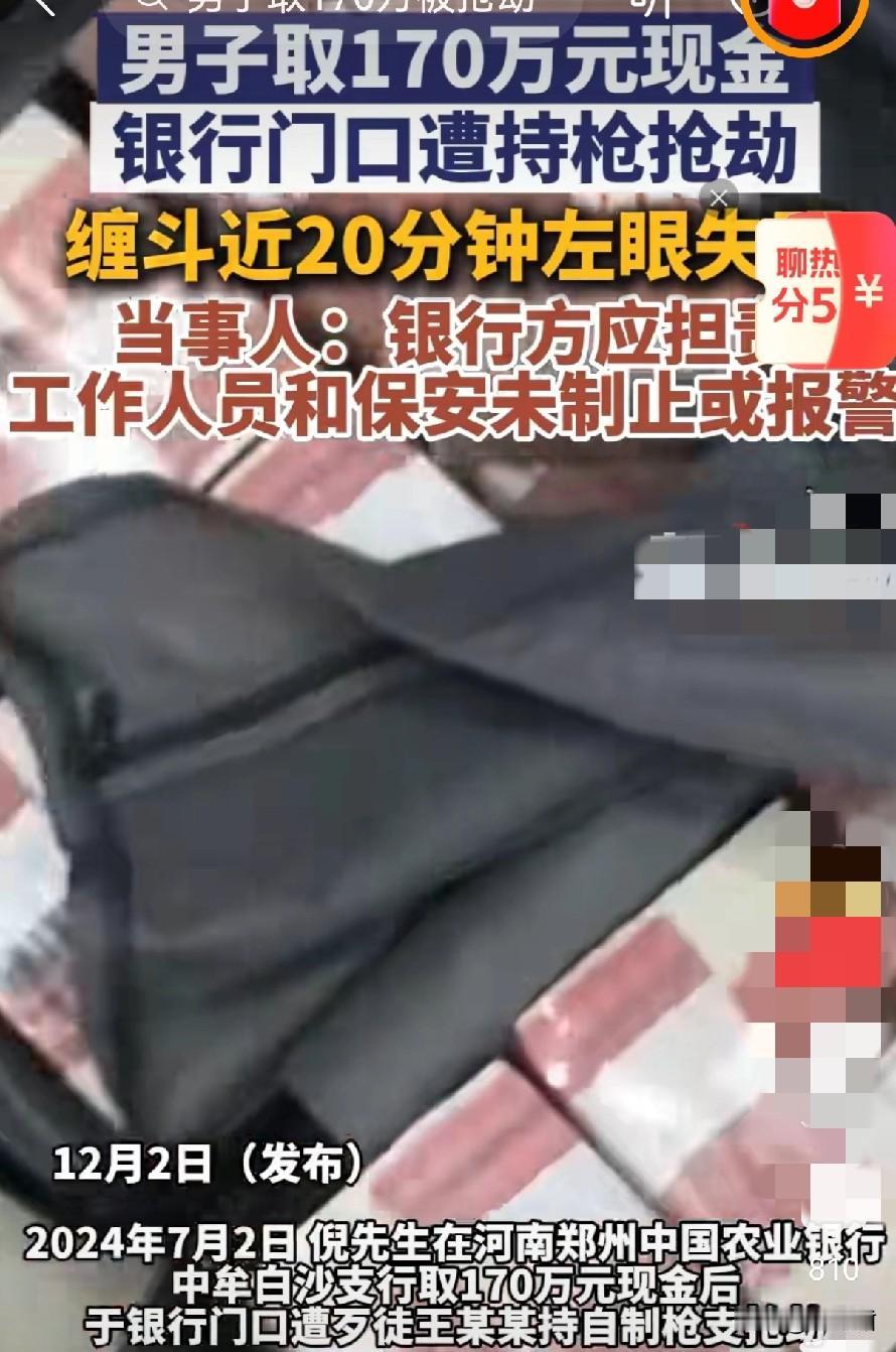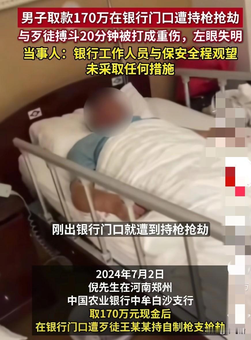 去年7月,河南郑州一男子从某银行预约取款170万,出门就被劫。果然是柜台当面点清,离柜概不负责啊,这家银行诠释了这一点。 事发时银行的工作人员和保安都在观望,没一人出手,还是路人报警,最后该男子与持自制枪的歹徒搏斗20余分钟,打成二级重伤,左眼失明。 于今年2月判处嫌疑人死刑,缓刑2年。本应让伤人者赔偿38万的医疗费,奈何法院只判定了寥寥7.3万。 于是该男子现在找到银行,要求索赔。理由是他提前预约了大额的现金,银行应该派工作人员采取安全措施,至少让他安全上车落锁才行,可是事发的时候,就在银行的门口发生了搏斗,理应有责任,可他们连个报警的人都没有。 随即有记者联系了该银行的相关负责人,均未作出回应。12月1日,才有当地银保监局介入调查此事。 按说这事银行确实有点不地道,自家门口发生抢劫,就算不在银行内部,你随手报个警怎么了,生怕会改变劫匪方向一样,这一看就是冲着取钱的人来的,这男子怎么也算是大客户了,在这一点上,银行着实没有人情味啊。 (图片来自网络视频)