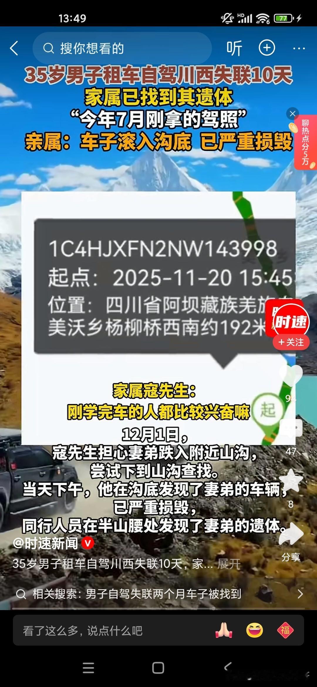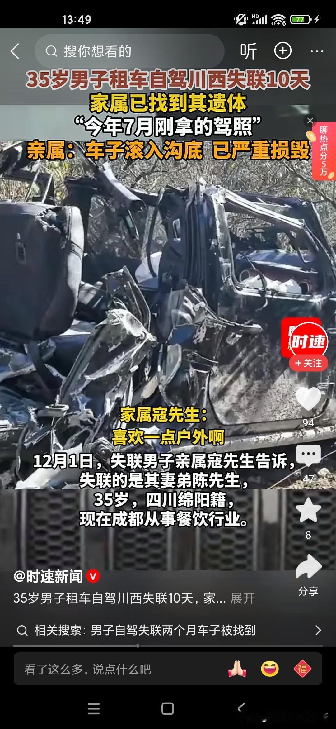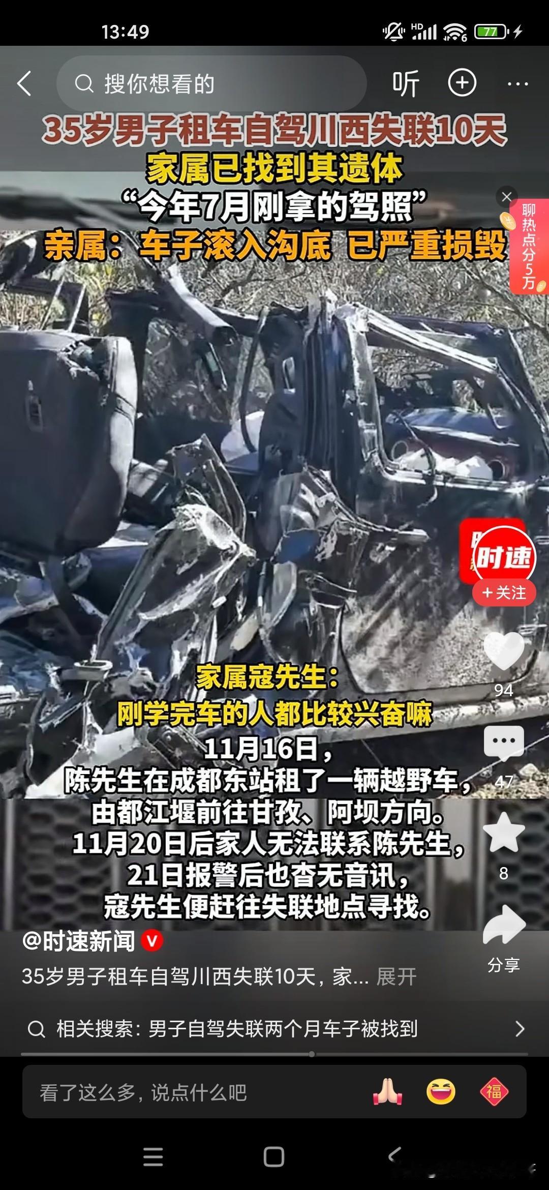 大家不要对自己的驾驶技术过度自信,你在平原地区和山地或者高原驾车是完全不一样的,像这位35岁的男子7月份才刚拿到驾照,他喜欢开越野车,喜欢去户外活动,喜欢露营,结果到达了川西,没想到成为他生命中的最后一站,因为川西是第一阶梯和第二阶梯的分界线那个地方,高低不平的,海拔落差也比较大,他去那地方不仅有高反,而且驾驶经验也不足,开的又比较快,最后就翻车了,人也死了。让人感觉到非常的惋惜,所以说大家如果是没有好的驾龄或者驾驶经验,身边没有人陪同的话,最好不要单独行动,川西出现这种翻车和落水的造成死亡的案例已经有好多个了!