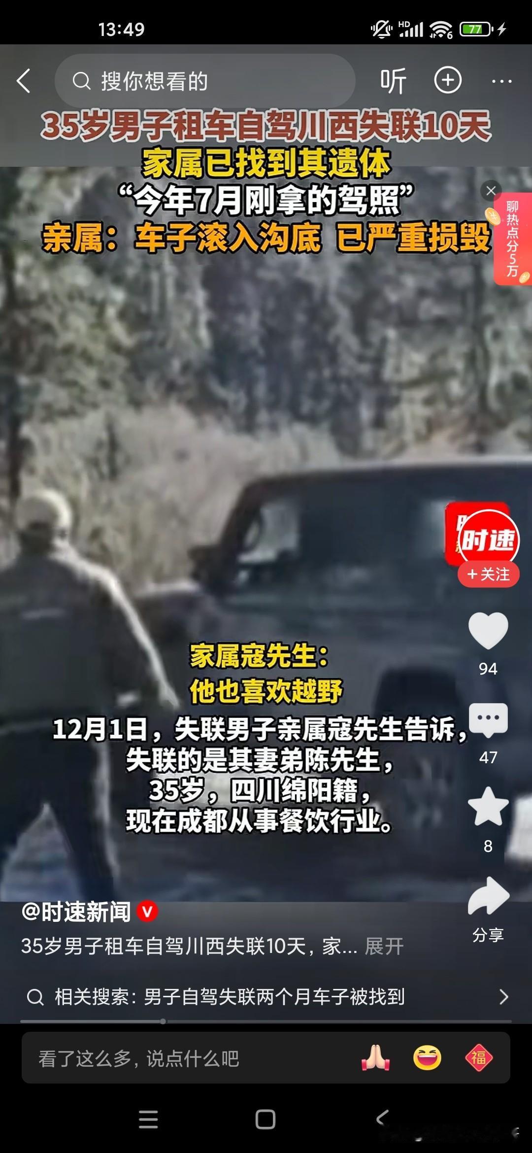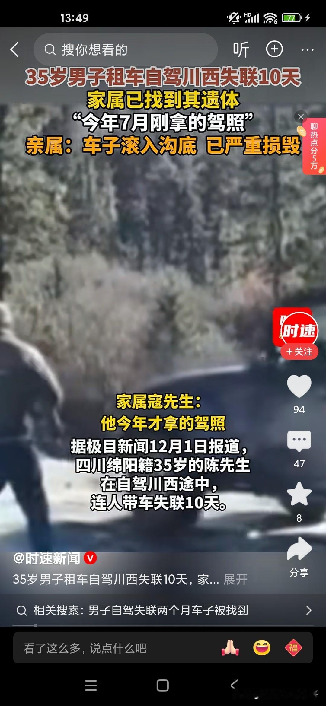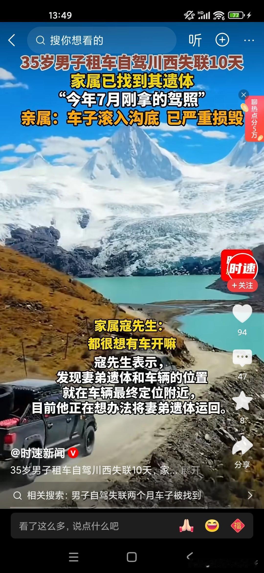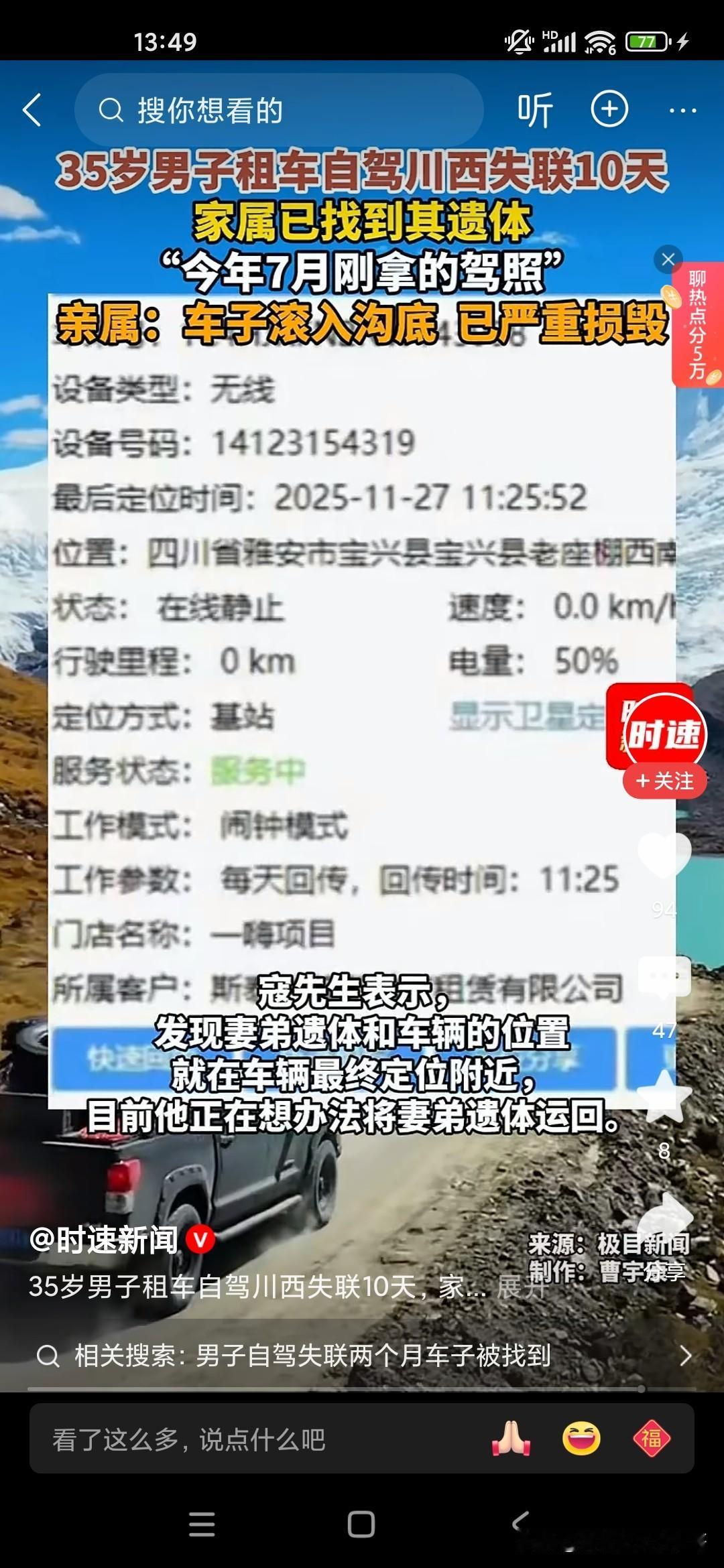 大家不要对自己的驾驶技术过度自信,你在平原地区和山地或者高原驾车是完全不一样的,像这位35岁的男子7月份才刚拿到驾照,他喜欢开越野车,喜欢去户外活动,喜欢露营,结果到达了川西,没想到成为他生命中的最后一站,因为川西是第一阶梯和第二阶梯的分界线那个地方,高低不平的,海拔落差也比较大,他去那地方不仅有高反,而且驾驶经验也不足,开的又比较快,最后就翻车了,人也死了。让人感觉到非常的惋惜,所以说大家如果是没有好的驾龄或者驾驶经验,身边没有人陪同的话,最好不要单独行动,川西出现这种翻车和落水的造成死亡的案例已经有好多个了!