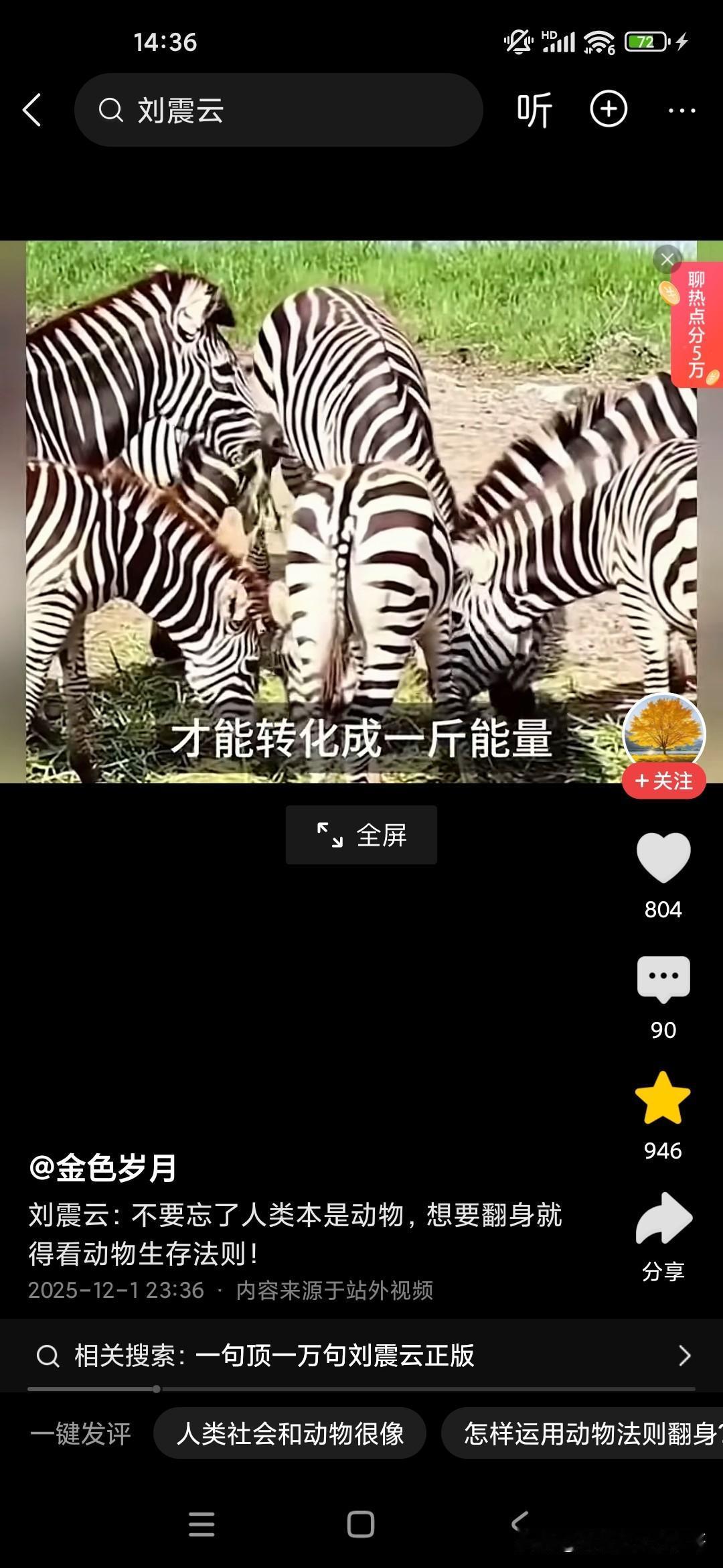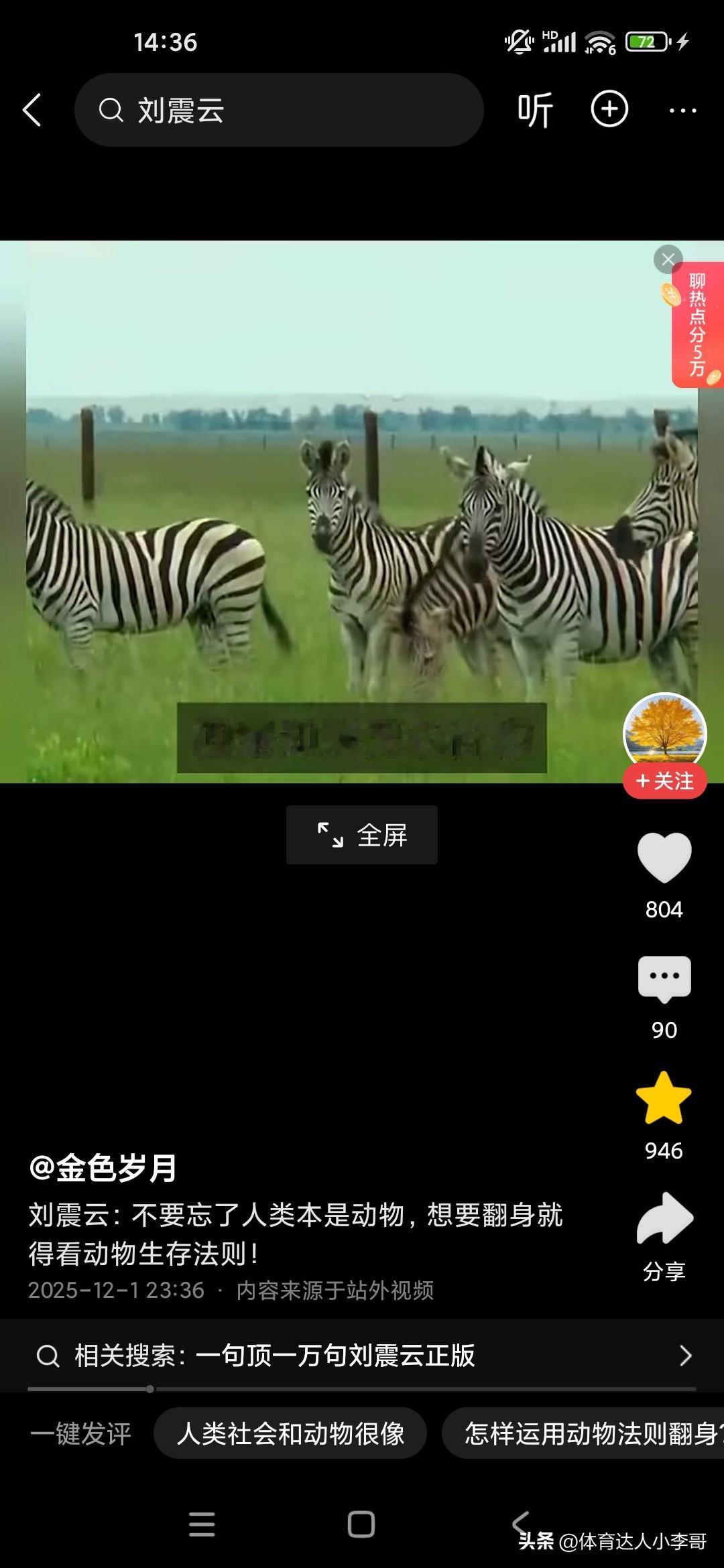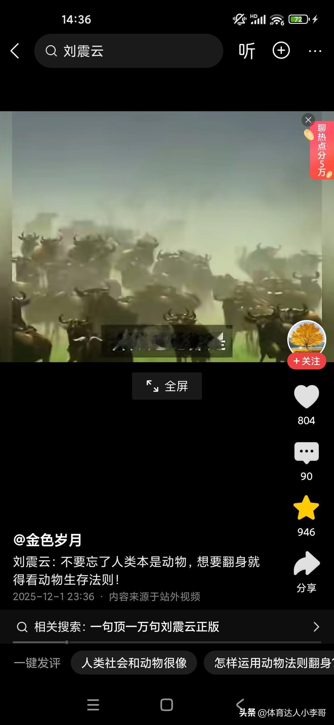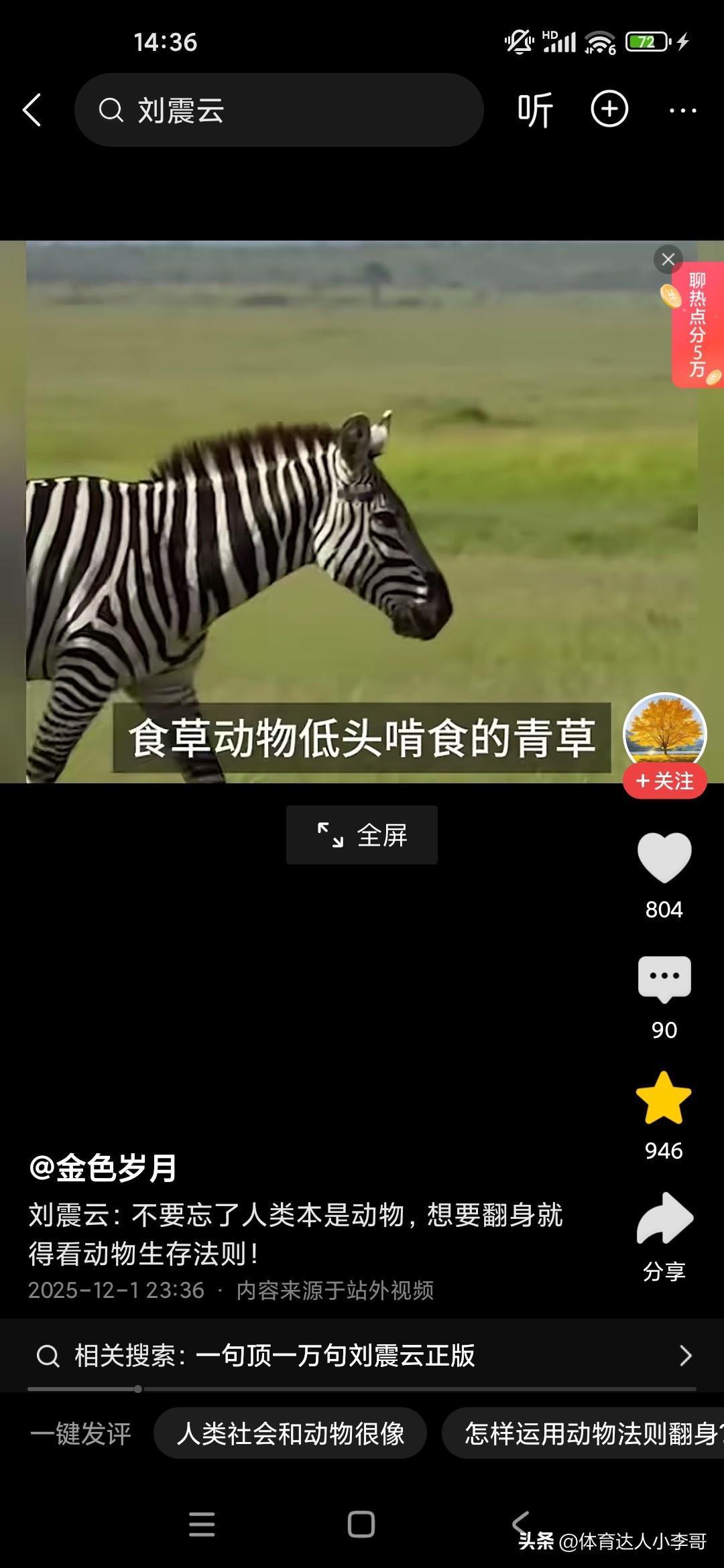 人本来就是动物,想要生存下来,必须要看懂动物世界! 刚听了刘震云老师的演讲,他觉得很多人就像食草动物一样,只能低头去吃草,而且一吃就要吃很久,而且丝毫没有安全性可言,他说富人的话,平时看起来都气定神闲的,但一旦一旦抓住机会,可能就赚了别人一辈子都无法企及的财富,这就是社会生存的法则,因为我们普通老百姓的话,很多人的话是干一天才有一天的活,可能就像斑马一样,吃了十几人十几斤草才能转换成一斤的能量,而富人的话,他有信息差和认知差,所以说他们只要轻轻利用杠杆原理,就可以撬动别人一辈子赚不到的财富,这就是我们穷人和富人的很大的差别,他建议我们人类本来就是动物,所以说我们要看动物的生存法则,这个社会是非常残酷的,你想生存下来就必须像动物一样去拼,站在食物链的顶端才可以!
