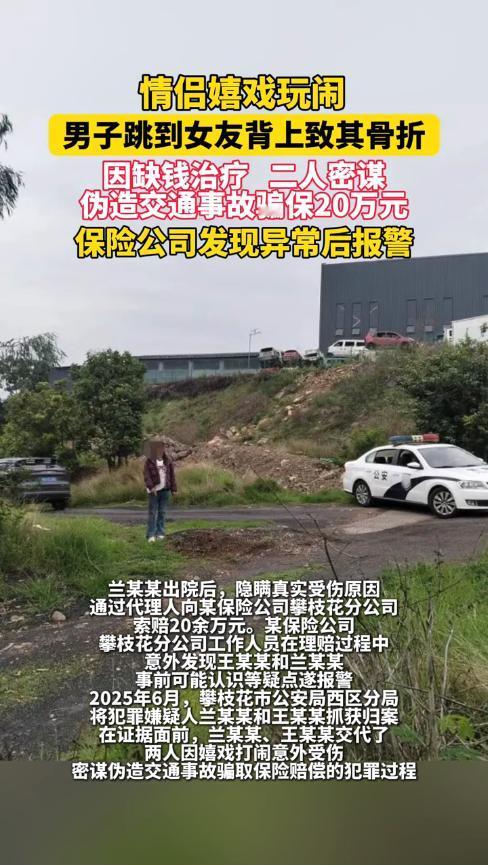 “胆子真大!”2024年6月,四川攀枝花,一男子和女友打闹过程中,突然跳到女友背上,要求对方背他,不料,由于男子太重,直接将女友压骨折!但二人没有钱医治,于是就伪造了交通事故,骗保20万元。网友:无知真可怕! 大多数司机为了图安全,都会购买相应的保险,这样就算发生交通事故也不用担心赔偿了,但如果故意制造交通事故,然后骗取保险金,这就属于违法行为了。 事发当天,王先生和兰女士在村子里玩耍,二人是情侣关系,玩耍过程中,王先生一下跳到女友背上,可是他高估了自己的体重,直接将女友的胸骨压骨折。 兰女士当即痛得倒在地上,然而,两人并没有第一时间赶往医院治疗,因为他们都没什么钱,为了搞些医疗费,二人商量过后,竟打算骗保。 就这样,王先生开车带着兰女士前往一处偏僻的路口,随后让她躺在车后方,假装是被自己撞倒的。 王先生报警后,交警认定他是全责,于是保险公司就先垫付了医药费,而兰女士出院后,又向保险公司索赔20万。 工作人员在理赔过程中,发现王先生和兰女士似乎很熟,经过走访询问,才知道二人是男女朋友关系,于是便报了警。 网友看后表示,真是聪明过头了,如果这么容易就能骗到钱,那还打什么工,也太看不起人家工作人员了! 信息来源:《情侣嬉戏玩闹时,男子突然跳到女友背上求背,意外致其骨折,因缺钱治疗,二人密谋伪造交通事故骗保20万!目前,二人因涉嫌保险诈骗罪被警方抓获,案件已移送人民检察院审查起诉。》第1眼新闻