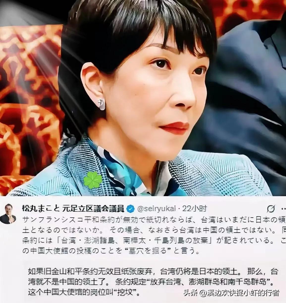 日本前议员疯了? 敢说台湾是日本领土!中方硬刚让高市早苗睡不着 我真的看傻了!日本前议员松丸诚最近放了个大厥词,说“中国不接受《旧金山和约》,台湾就是日本领土”,这简直是把历史当儿戏,纯属睁着眼睛说瞎话! 先掰扯明白《旧金山和约》就是美国当年搞的单边操作,把中苏这些战胜国排除在外,说白了就是个非法无效的“废纸”,中方从始至终就没认过!而台湾是中国的,早有铁证——《开罗宣言》《波茨坦公告》白纸黑字写着,日本必须归还窃取的中国领土,这是全世界都认的二战胜利成果,哪轮得到他瞎嘚瑟? 更有意思的是这波言论直接把日本首相高市早苗架在了火上烤。她之前就含糊其辞,说“台湾有事可能是日本存亡危机”,现在被松丸的极端言论一闹,想撇清都难,简直进退两难 !说白了,日本右翼就是想借台海搞事,一边试图突破和平宪法,一边干涉中国内政,算盘打得挺精。 但咱中方可没惯着!新华社直接严正驳斥,外交部火速抗议,中国海军舰艇在相关海域常态化巡航,用实际行动告诉他们:捍卫主权不是闹着玩的 !真当现在还是几十年前?想重温军国主义旧梦,纯属自讨苦吃。 台湾是中国的核心利益,这是不可逾越的红线。不管日本右翼怎么跳脚,怎么歪曲历史,都改变不了这个事实。那些企图分裂别人国家的人,最后注定搬起石头砸自己的脚! 你们觉得日本右翼这波操作能得逞吗?评论区聊聊你的看法! 台湾问题 中日关系 历史不容篡改 热点热议