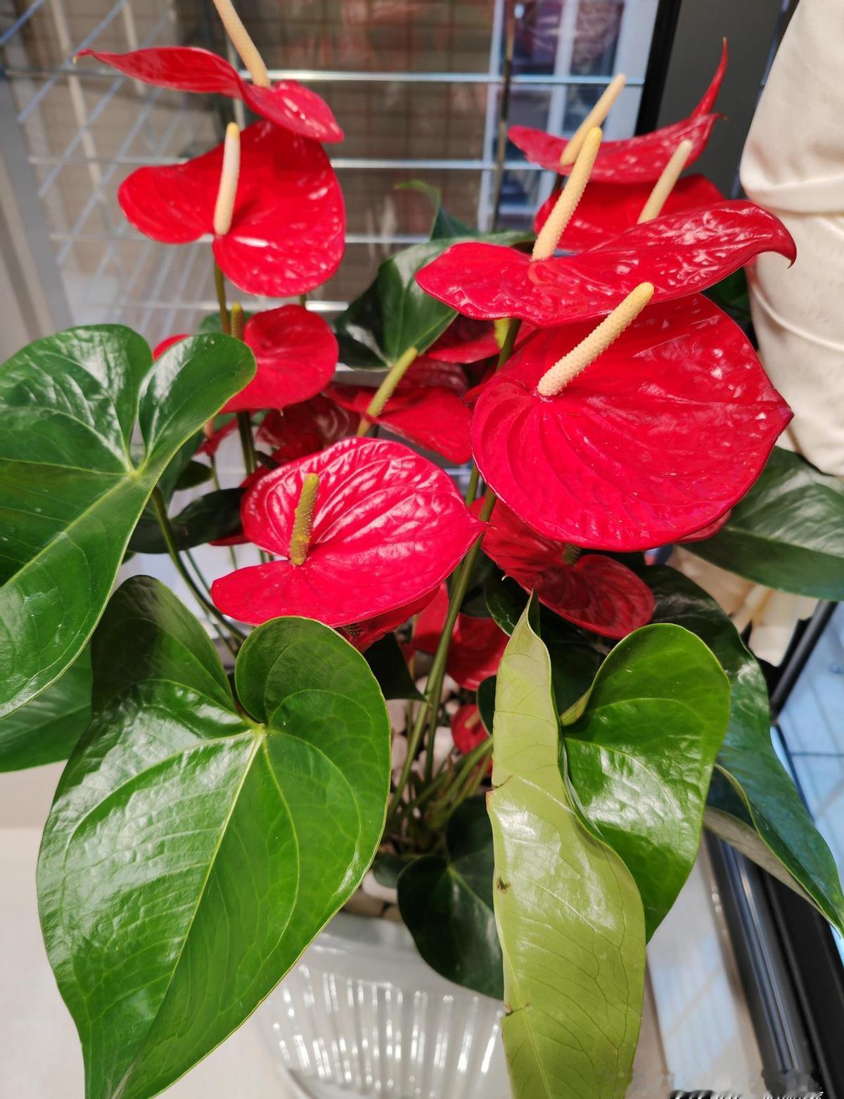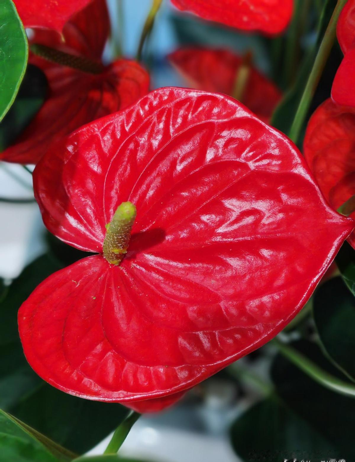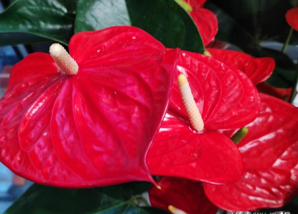 红掌不是花,是叶子在装腔作势。 那抹红,是苞片撑起的戏台,中间黄柱子才是真花,密