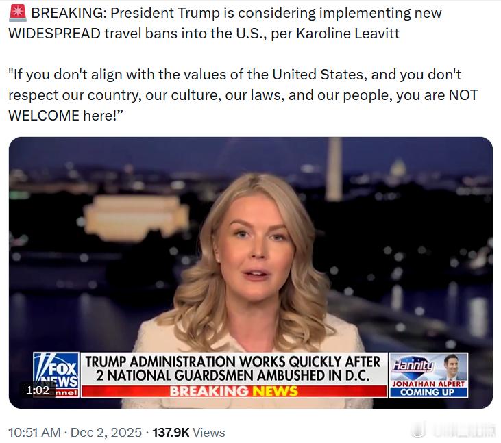 白宫新闻秘书卡罗琳·莱维特表示,特朗普总统正在考虑在全美范围内实施新的、更广泛的旅行禁令。“如果你不认同美国的价值观,不尊重我们的国家、文化、法律和人民,那你在这里就不受欢迎!”