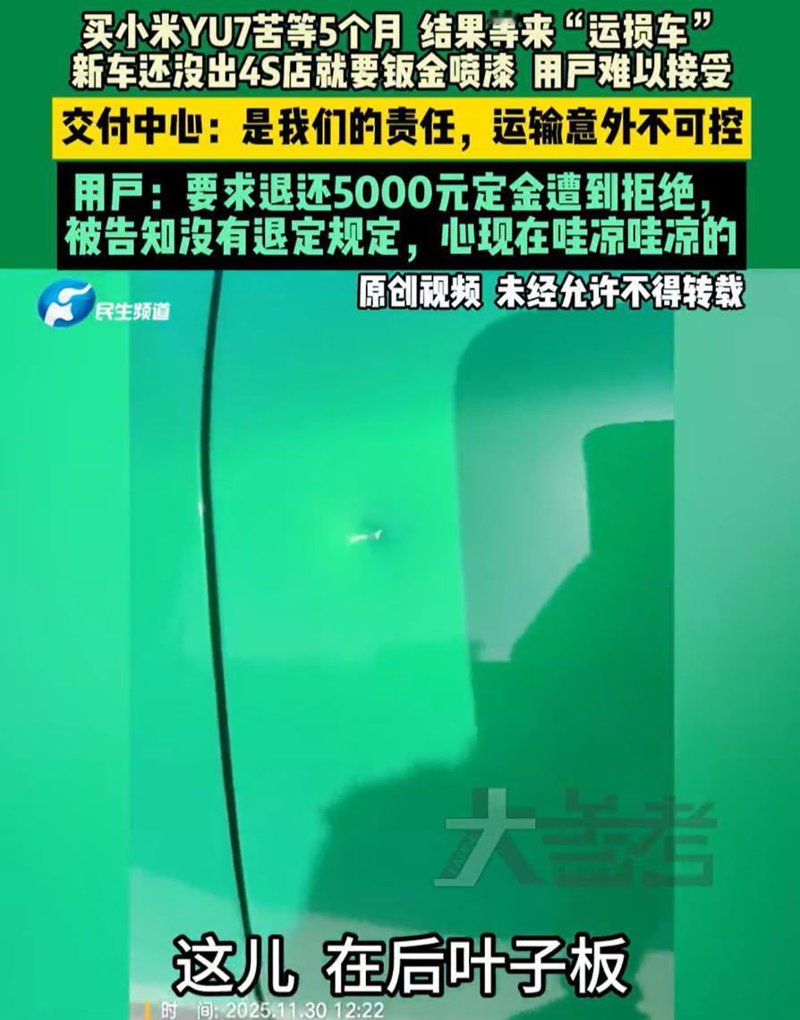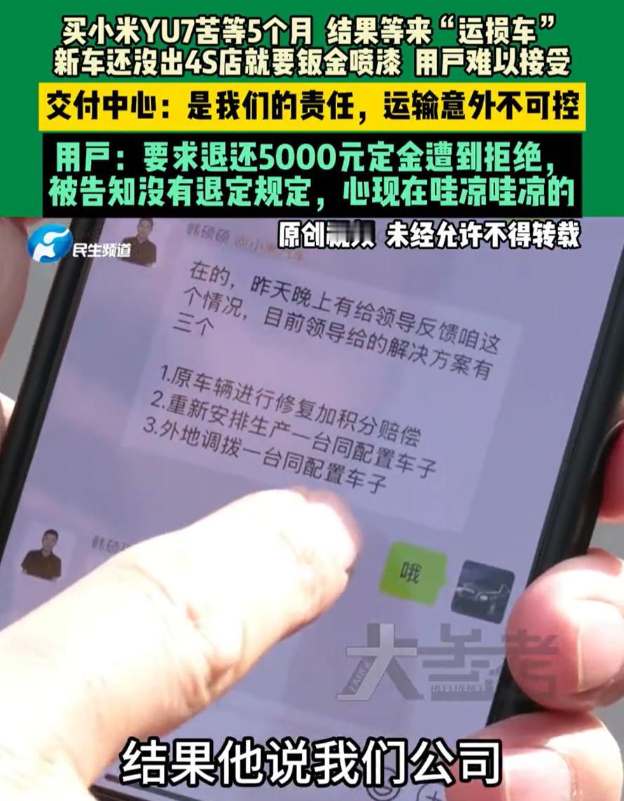 河南郑州,男子交5000元定金订了一辆小米YU7,等了5个月,终于是盼到了提车的日子,结果车子还没开出4S店,却被告知车子需要重新喷漆,因为运输过程中受损,属于是“运损车”,男子要求退定金,但店里却回应:公司没有这个规定。男子:心里哇凉哇凉的 许先生介绍,他到4S店提车时,工作人员告知,车子后叶子板的位置有个凹陷,他这一看才发现,竟然有一个大坑,甚至都不算是划痕 新车还没到手,就出现问题,许先生心里实在无法接受,于是找到店里商量,店家倒是承认的挺痛快,说是运输过程中发生的意外,他们也不可控 商量了一番,给出三个解决方案,第一是帮忙修复车辆,并且给出积分赔偿。第二是安排生产统一配置车子。第三是从外地调拨一台同配置车子 对于这三个方案,许先生都不接受,他认为这是商家违约在先,问题不在他,所以就想要退还定金,但遭到了店家拒绝 他将这个事反映给媒体后,也引起了不少网友讨论 有网友认为:这和质量没有关系,是运输过程造成的损伤,而且又不是不给换车 但也有网友表示:车子没交付就出现问题,不想再要了很正常,这都等五个月,再换车谁知道还要等多久 说实话,从情感方面去想,还是能理解顾客心情的,一辆车对普通家庭来说不是随便买着玩的东西,价格是一方面,更重要的是心理预期 你期待了五个月,就是想完整地接过一辆干干净净的车。新车在你手里受个小伤,那能认,这是自己遇见的事。但车还在商家手里、甚至还没交付,就出了问题,这确实说不过去 现实一点说,运损车法律上确实不算质量瑕疵,商家提供换车方案也算在努力补救。但消费者的选择权同样应该被尊重。你可以给出方案,他也可以选择不要。双方都没有问题,问题是现在卡在制度里,4S店死守定金不退,消费者自然会感觉吃亏 车企和4S店如果能在这种环节给出更灵活的处理方式,比如明确说明运损可以无条件退订,或许情况就不一样了