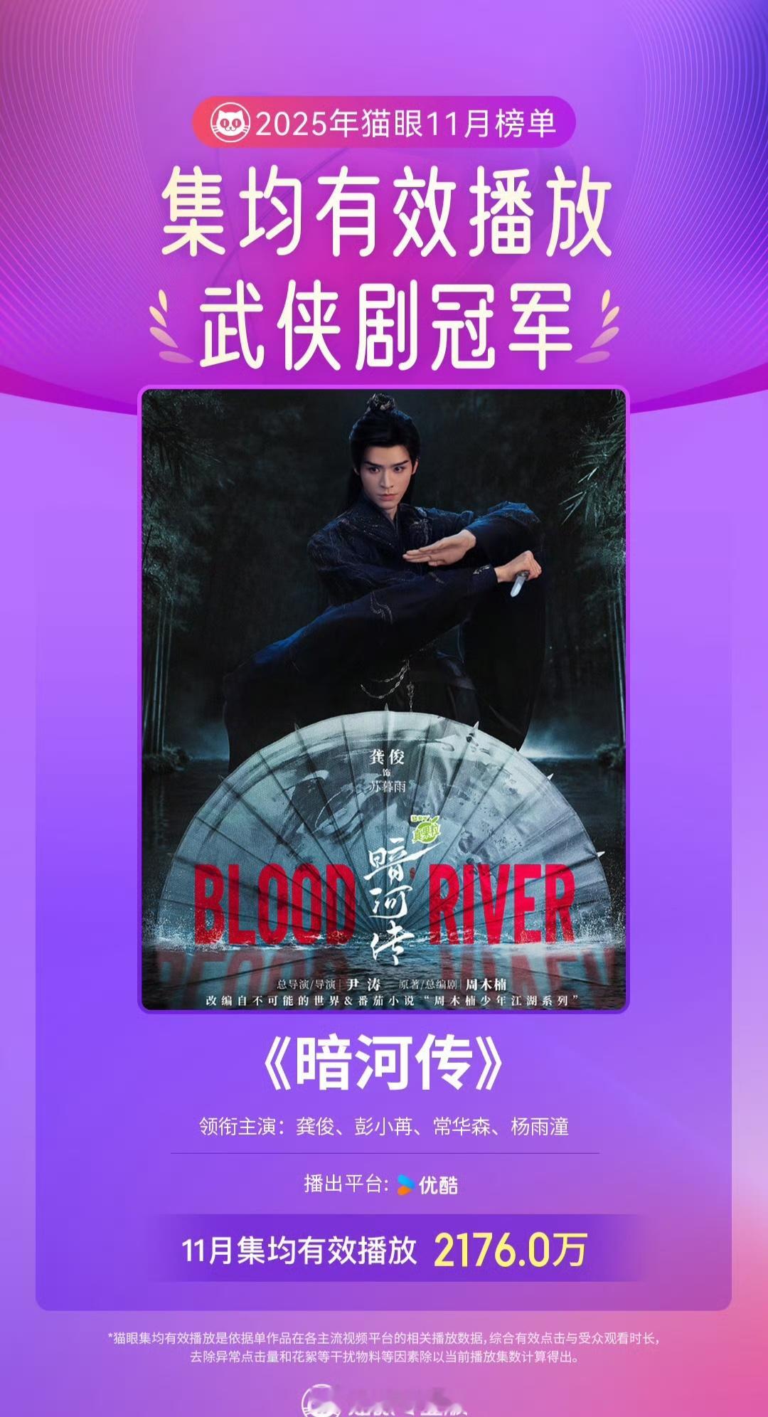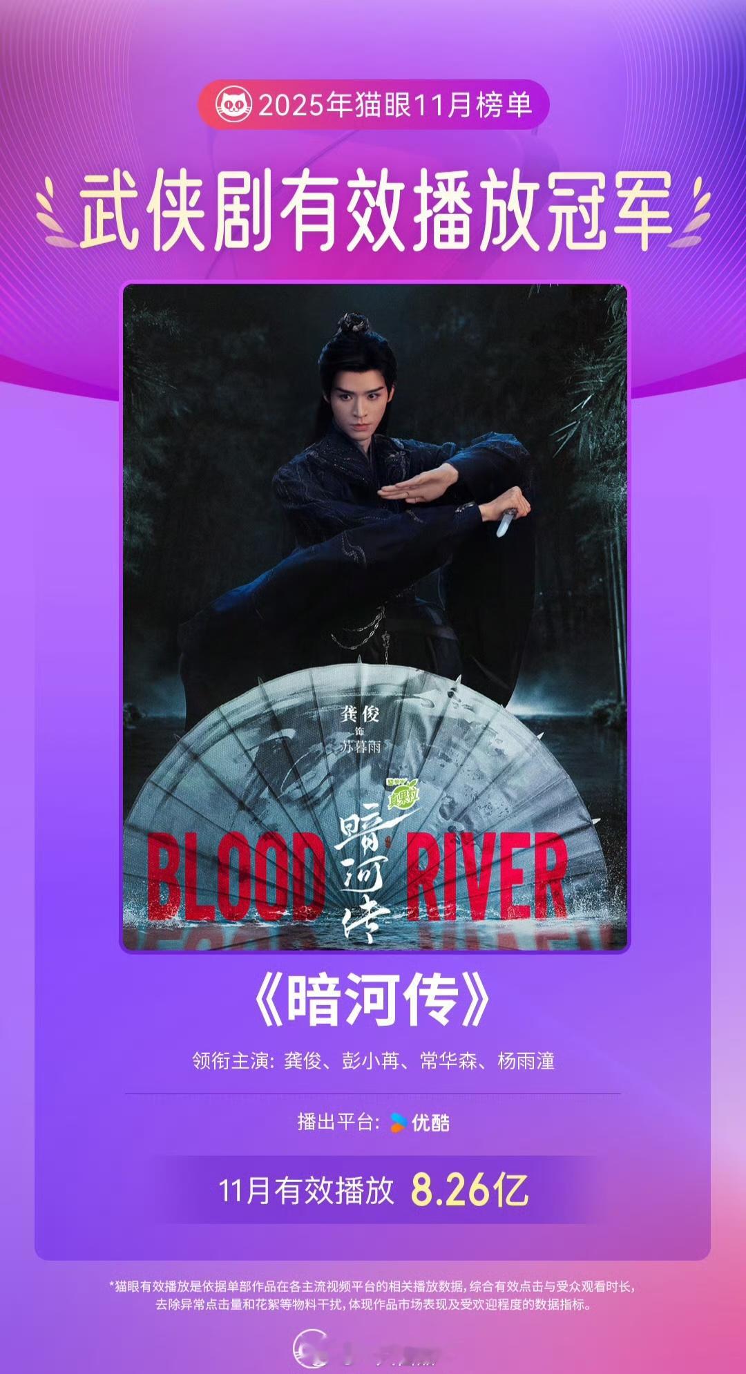 龚俊《暗河传》获得猫眼11月武侠剧有效播放冠军和集均有效播放武侠剧冠军,双榜TO