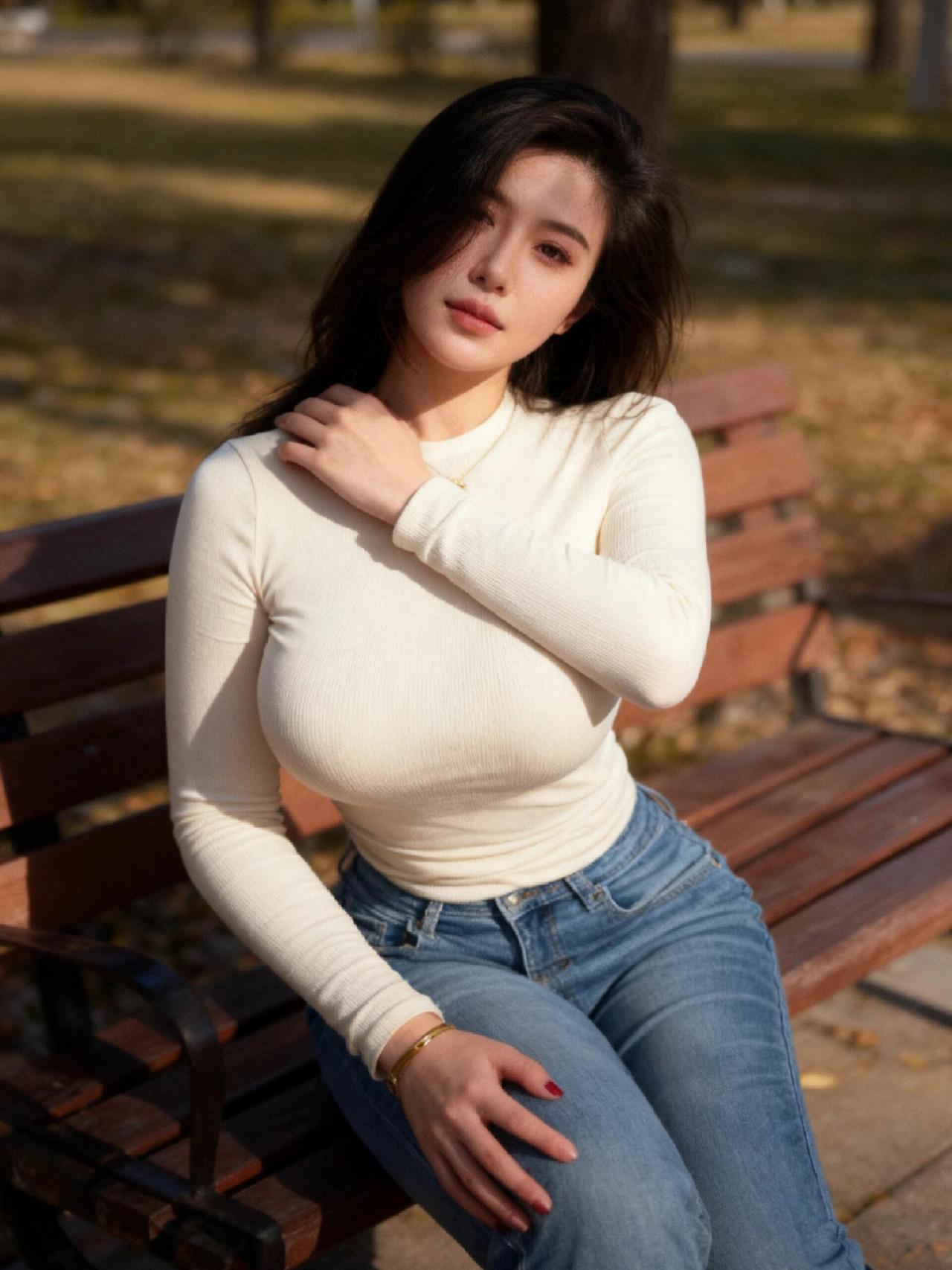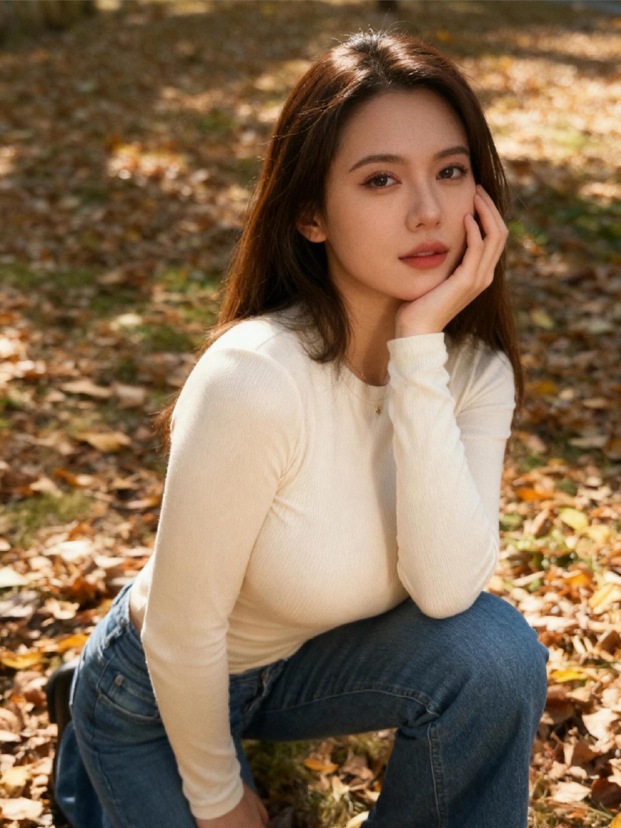 《念奴娇·秋郊遇美人》 晴郊铺锦,正霜林换叶,金风裁绮。 石径斜偎云鬓女,素袂轻笼柔腻。 腕枕香腮,肩凝玉露,笑靥融秋霁。 明眸流盼,暗惊鸿影清丽。 闲坐长椅慵慵,纤指掠鬓,钏响摇环佩。 醉卧芳丛裙展翠,衬得霞腮更媚。 日脚穿林,光斑缀鬓,人与秋光醉。 西风偷顾,也教花影低避。