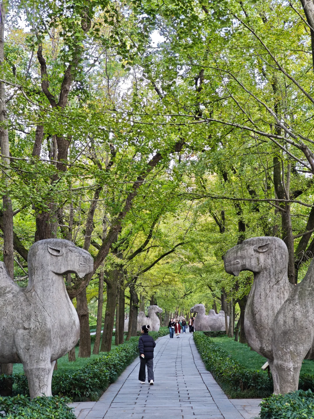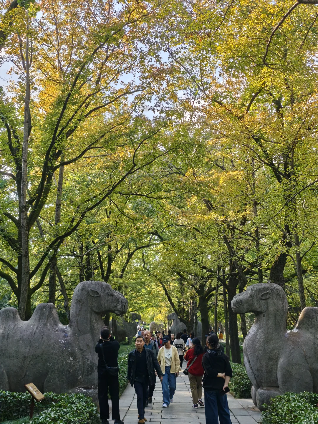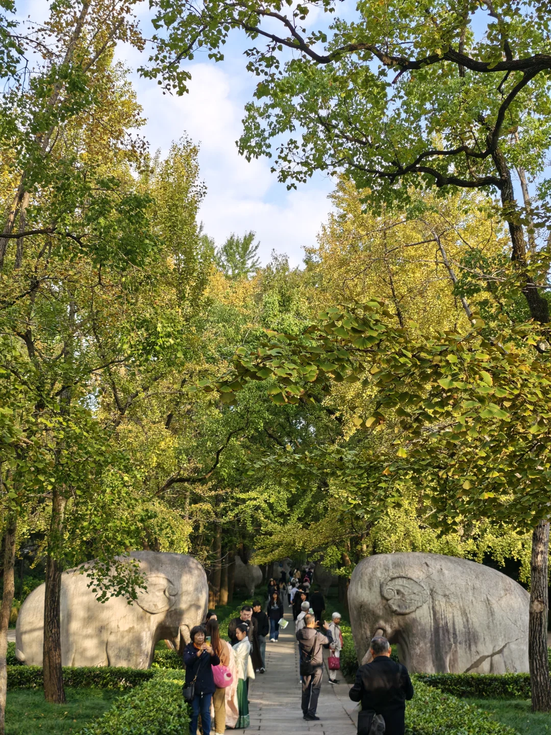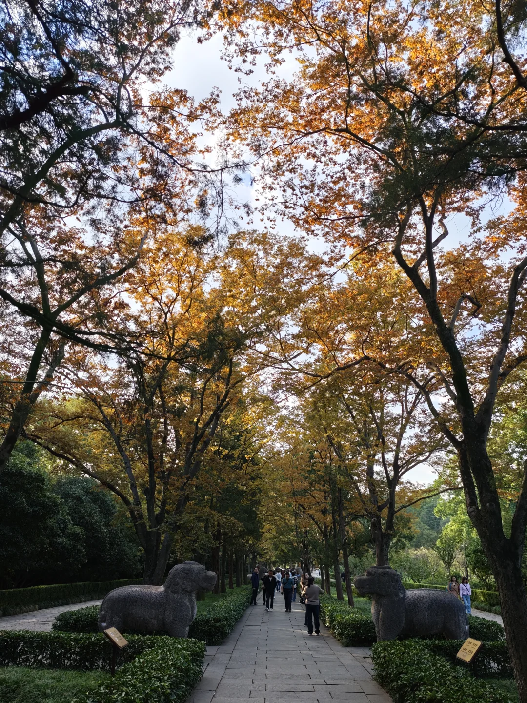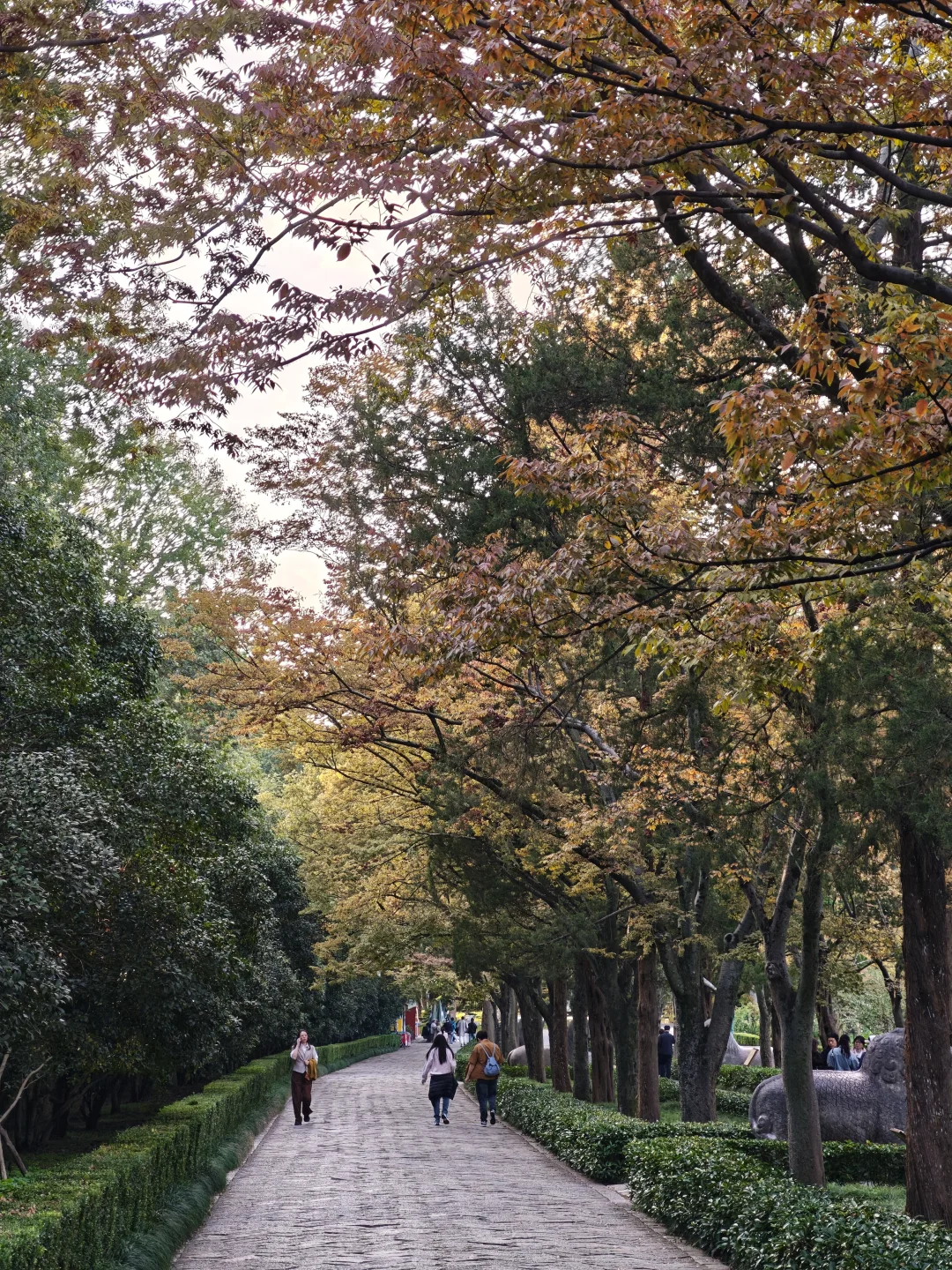 💥特别说明:石象路神道总长600多米,主要秋色是榉树、乌桕、圆柏、银杏、枫香,因植被变色时间和分布区域不同,所以变色进度会出现差异,比如乌桕落光了,银杏才迎来高光时刻;而同样的位置阳面和阴面拍照色彩也会不同,所以参观时不妨时常回个头,或者往返走一圈,看不一样的风景~