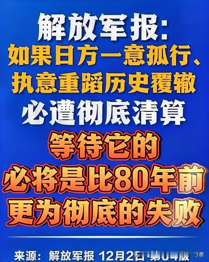 解放军终于亮剑!警告日本比80年前更惨的失败,是时候解放台湾了! 12月2日解放军直接发狠话,这话掷地有声:“如果日方一意孤行,执意重蹈历史覆辙,必遭彻底清算,等待它的必将是比80年前更为彻底的失败!” 这可不是随口说说,是咱们解放军憋了太久的硬气回应! 看看日本现在狂到什么地步?首相高市早苗刚上台就没闲着,公然叫嚣“台湾有事就是日本有事”,甚至放话要武力介入台海——这是把咱们的核心利益当儿戏吗? 更过分的是,他们一边砸11万亿日元(近5000亿人民币)搞军费,一边在离台湾才110公里的与那国岛部署导弹,还买了400枚“战斧”巡航导弹,明摆着就是要复活军国主义! 12月2号当天,日本“瑞宝丸”号渔船还敢非法闯钓鱼岛,被咱们海警3分钟就合围驱离,这已经是他们今年第5次挑衅了! 想想当年,九一八事变、强征慰安妇、细菌战,桩桩件件都是血债,半个地球都被他们害过。现在好了伤疤忘了疼,不仅不认错,还想跟着美国插手台湾问题,真当咱们还是80年前的中国? 再看看台湾那边,赖清德之流还在搞“台独”,叫嚣“台湾是主权独立国家”,拿着台湾民众的安危当赌注,勾连美日想分裂祖国。可他们忘了,台湾从来就是中国的一部分,《开罗宣言》《波茨坦公告》写得明明白白,解放军多战区早就严阵以待,“东风快递”可不是摆设! 现在国际形势摆这儿了,美日台还想搞军事勾结,搞什么“台海有事”联演,这就是在玩火!咱们爱好和平,但绝不怕打仗,对付军国主义必须拿出硬态度,绝不让历史重演;解放台湾更是历史大事、人间正道! 支持解放军亮剑的,支持早日解放台湾的,评论区扣“中国必胜”!让全世界看看,14亿中国人捍卫主权的决心,谁也挡不住!