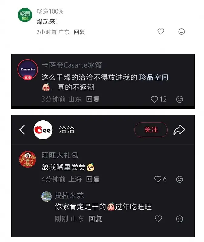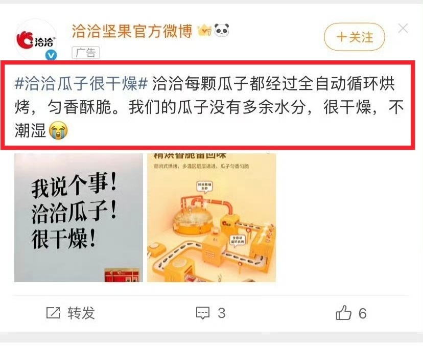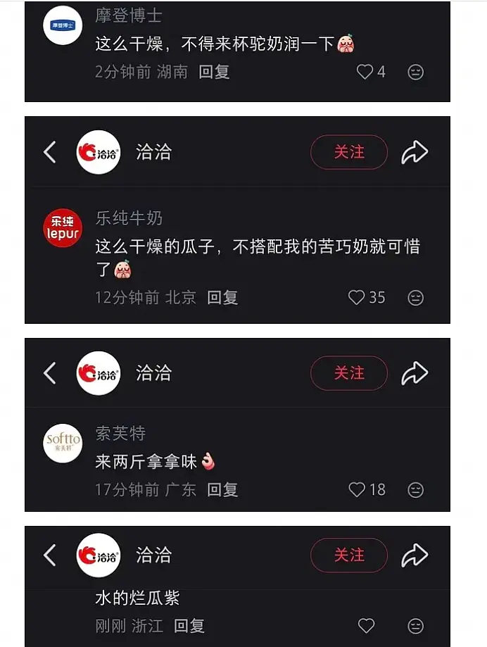 洽洽瓜子发文说自家瓜子没有水分,很干燥,不潮湿!称洽洽瓜子≠洽洽瓜紫,结果广场就被杨紫粉丝冲了,觉得品牌是在内涵自家剧云合数据有水分,这两天正和罗云熙家在battle,所以精准对号入座,评论区也被各大合作过的品牌团建了~好热闹啊、
