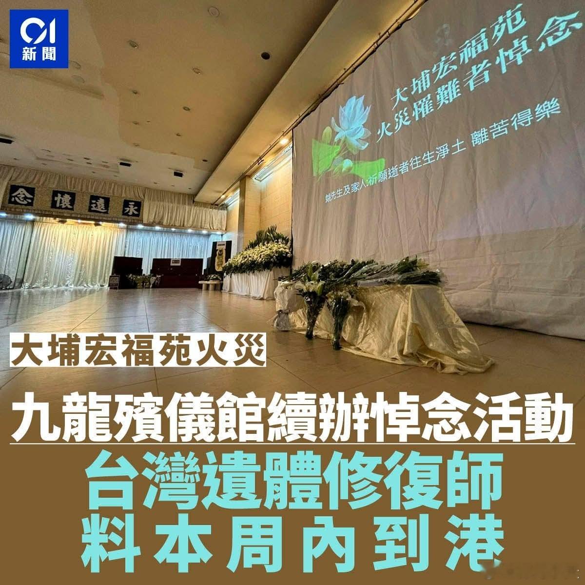 九龙殡仪馆续办悼念活动,台湾遗体修复师料本周抵港香港九龙殡仪馆一连三日为宏福苑罹难者举行公众悼念活动,今日(2日)早上陆续有市民到殡仪馆签名献花,整个礼堂几乎坐满。馆方表示,会向罹难者提供免费殡仪及遗体修复服务,并会举行佛教及道教诵经仪式。总经理甘亮得称,馆方近年有与台湾的遗体修复师有合作,今次火灾后遗体处理工作得到对方支援,而香港入境处特事特办为台湾遗体修复师加急办理工作签证,估计修复师本周内就会到港,协助进行遇难者遗体修复等殡葬工作。香港大火之下的竹棚工香港向火灾死难者家属发放慰问金