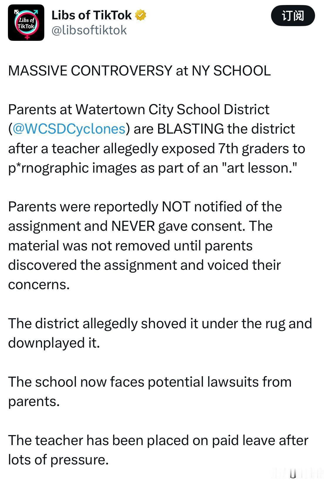 纽约市沃特敦市学区(Watertown CSD)的家长们正在猛烈抨击该学区,因为一名教师涉嫌在“艺术课”中向七年级学生展示色情图片。 据报道,家长事先并未被告知这项作业,也从未同意。直到家长发现这项作业并表达了他们的担忧后,相关材料才被删除。 据称,该地区对此事采取了掩盖和淡化处理的态度。 学校现在可能面临家长提起的诉讼。 在各方压力下,这位老师已被停职带薪休假。