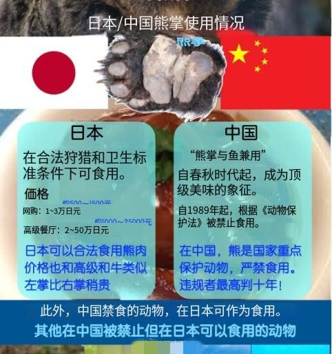 日本网民制作的中日食用熊掌法律对照图,日本甚至开发出食用熊掌美食地图。国际上各种动物保护协会是不是应该出来做事了?毕竟今年以来,光北海道已有超过960头熊被猎杀。是人类抢了熊的居住地,千百年来熊在北海道生活的挺好的。[吐舌] 日本水产品 黑熊熊掌 中日水产品