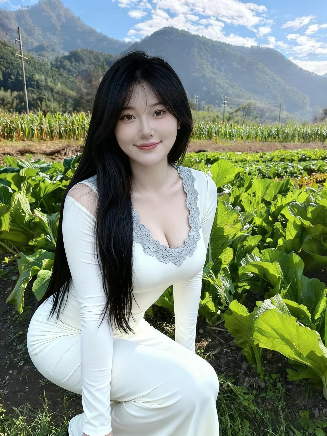 俯身蹲坐菜畦边,野色铺笺接远巅。 玉米摇金分霁色,白菜堆绿拥晴烟。 发梢偶坠露珠碎,衣褶时沾嫩草鲜。 抬眼浮云舒卷处,风携凉意抚香肩。