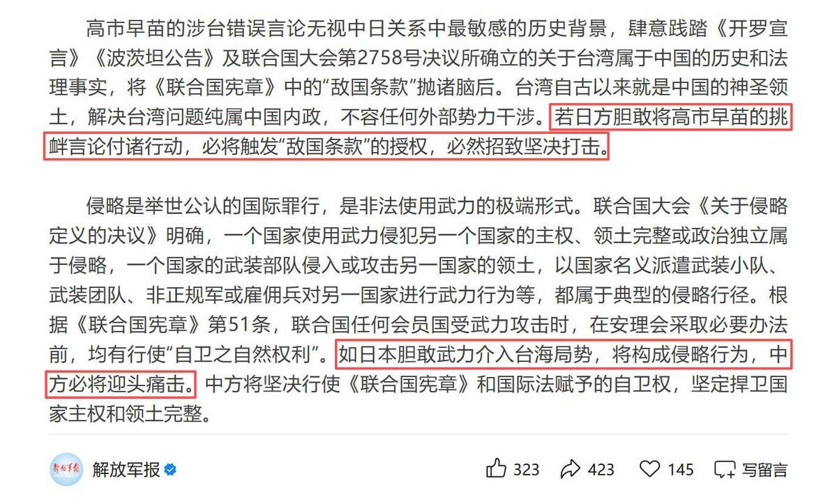 中方第二次致函联合国,日本气炸了:中国的指控完全不可接受! 当地时间12月1日,中国驻联合国代表傅聪,再次给联合国秘书长古特雷斯写了封信,阐明了中方立场,并针对高市早苗的涉台海挑衅言论,以及日方此前给联合国信函中的无理狡辩言论进行严正了批驳。 2日的外交部记者会上,发言人林剑也回应了此事,对日方进行了批驳,并警告日方不要一再背信弃义,不要为军国主义招魂。中方坚决反对日方为军国主义招魂 而这封信,似乎让日本人气炸了。日本内阁官房长官木原稔在2日的记者会上声称,中国的指控完全不可接受,日方早已多次向中方言明,关于“日本立场改变的说法完全不实”。评论区里的日本人也在叫嚣“中日必有一战”、“日本必须展示强硬”,表现得好像日本是受害者一样。 其实,中方的两封信件,以及多次发言,不仅指出了高市早苗的言论错误,还清晰指出,日本至今仍然回避在台湾问题上进行明确表态,只说“立场没变”,却绝口不提他们的立场到底是什么,显然就是想蒙混过关。 不过,《解放军报》已经在最新文章中再次发出了警告:若日方胆敢武力介入台海,必将触发“敌国条款”,招致中方的坚决打击!这话已经撂在这儿了,最终结果如何,就看日本人要如何选择了。