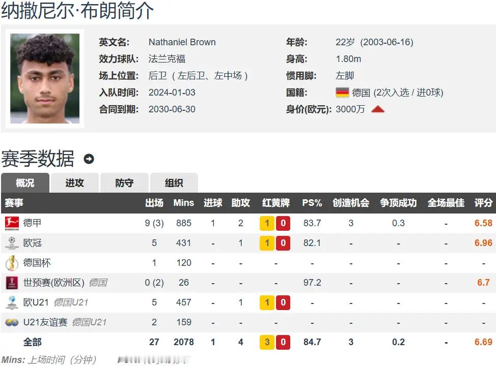 法鹰再出新星!皇马巴萨曼联争抢22岁布朗 标价7000万欧元德甲法兰克福堪称足坛“星工厂”,即便无缘争冠,也总能培养出极具价值的新星并实现收益最大化,22岁的德国左后卫纳撒尼尔-布朗便是最新代表。据记者Florian Plettenberg消息,这位新晋国脚已进入皇马明年夏窗引援名单——欧冠法兰克福0-3不敌亚特兰大的比赛中,皇马球探现场对其进行了考察。除皇马外,巴萨、曼联也对布朗青睐有加,三大豪门将展开争夺战。法兰克福高层深知留不住球员,预计布朗会在本赛季结束后夏窗离队,体育主管马库斯-克勒舍为其标出6000万至7000万欧元的转会费。布朗出自纽伦堡青训,2024年1月以300万欧元转会法兰克福(后回租至赛季结束),2024-25赛季正式加盟后,至今为球队出战51场贡献4球10助攻。现年22岁的他身高1.80米,左脚将,主打左后卫亦可胜任左中场,德转当前估价3000万欧元,合同有效期至2030年。本赛季至今,布朗为法兰克福出场18次(15次首发),累计登场1436分钟,交出1球3助攻的成绩单。