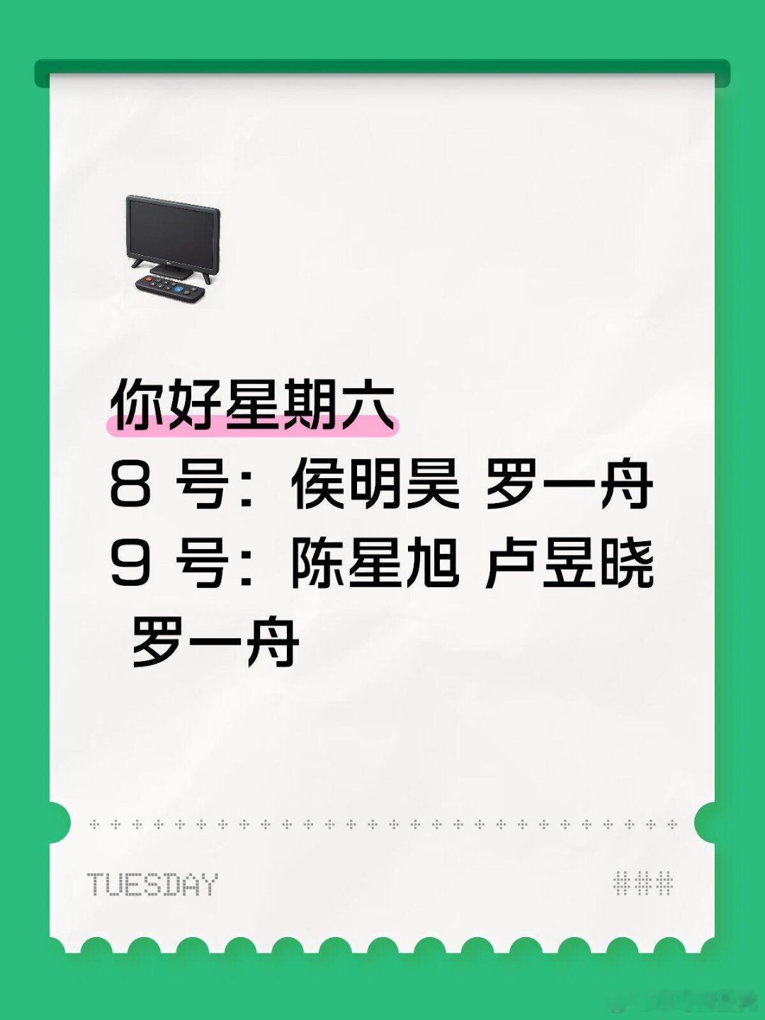 《你好星期六》12月8-9号录制常驻嘉宾:何炅、丁程鑫8号嘉宾:侯明昊、罗一舟9号嘉宾:陈星旭、卢昱晓、罗一舟你好星期六 ‖你好星期六