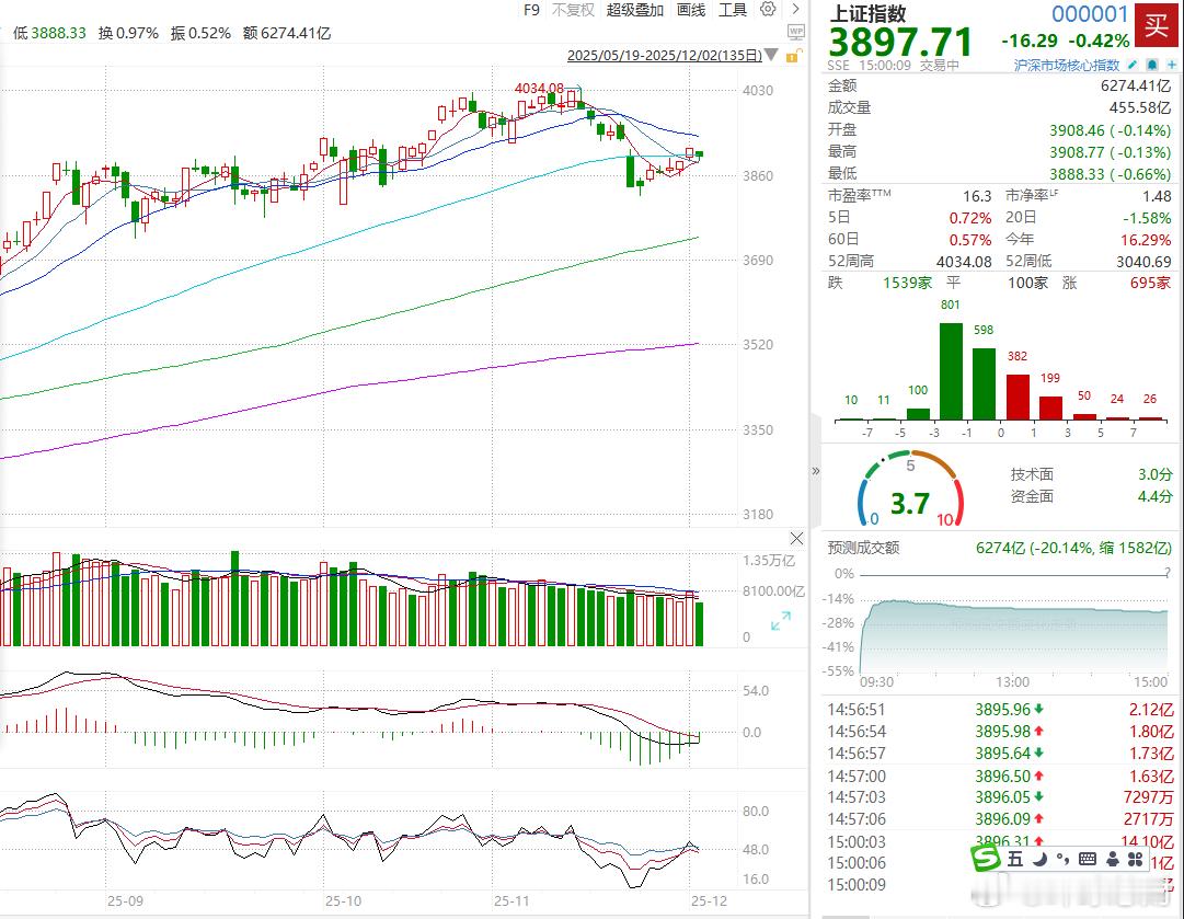 收盘说说A股震荡调整失守3900点福建板块逆势走强A股地产板块走强【沪指缩量跌0.42%,福建本地股掀涨停潮】香港万得通讯社报道,12月2日,A股缩量下跌,题材股多数回调,盘面相对清淡,板块轮动放缓。上证指数收跌0.42%报3897.71点,深证成指跌0.68%,创业板指跌0.69%。A股全天成交1.61万亿元,上日成交1.89万亿元。锂电池产业链全线走低,电解液、锂矿、固态电池方向领跌,石大胜华、天际股份、鹏辉能源等跌幅明显。影视股回调,幸福蓝海、上海电影、中国电影跌幅居前。此外,RO、GPU、稀土永磁、超硬材料、服务器、机器人、光刻机概念股纷纷走弱。医药商业股持续拉升,海王生物5连板,人民同泰、合富中国涨停。华夏基金认为,美联储的降息带来医药行业投融资复苏,叠加国内资本市场好转,将共同推动企业融资难度降低,新药研发支出增加,行业正面逻辑确定性更强。建议投资者保持对医药行业的持续关注。福建本地股掀涨停潮,平潭发展、榕基软件、太阳电缆、海欣食品、福建高速等10余股涨停。消息面上,近期,福建省“十五五”规划建议发布。建议提到,持续深化国资国企改革,加快平潭综合实验区开放发展等。中信建投表示,福建是我国制造业强省。支柱产业为电气机械和器材制造业、计算机、通讯和其他电子设备制造业等,前瞻布局未来产业,打造具备国际竞争力的战略性新兴产业集群。AI手机概念股延续局部活跃,道明光学4连板,福蓉科技2连板。银河证券表示,消费电子板块手机推荐关注苹果链和华为链,消费电子新品建议关注AI眼镜、全景无人机等新品类投资机会。中国银河证券认为,从12月来看,市场仍处于风格频繁切换阶段,或以结构性行情为主。一方面,作为年末最关键的政策窗口,中央经济工作会议将明确2026年政策主线,在科技创新、扩内需、反内卷、稳地产等方面或将作出重点部署。另一方面,一系列产业会议可能成为主题行情的重要催化剂,关注即将召开的2025“人工智能+”产业生态大会、脑机接口大会等。而外部环境依然存在不确定性,12月美联储议息会议表态对全球市场流动性的潜在影响值得关注。年末风格轮动中关注防御性板块配置机会,同时聚焦明年景气方向的布局。申万宏源认为,进攻资产(科技和顺周期)有效反弹容易出现,但向上突破逻辑难以兑现,春季行情上限不高。春季行情在“牛市两段论”中的定位:春季行情可能是高位震荡行情中的一波反弹(总体市场更偏向此情形);或者是调整幅度到位,向震荡阶段过渡的一波反弹(科技更偏向此情形)。重点关注,性价比矛盾本就较小 + 春季有望兑现产业催化的创新药和国防军工。AI算力、存储、储能、机器人等也会有反弹机会。港股延续高beta特征,恒生科技调整更充分,反弹波段也会更有弹性。兴业证券认为,往后看,随着前期扰动逐步过去,市场有望迈入一个新的阶段。后续,从日历效应角度出发,大势上的焦点在于跨年行情能否如期启动。岁末年初是孕育躁动行情的重要窗口,市场处于基本面的真空期,叠加重要会议窗口临近政策预期升温,同时部分年份在年初即启动降准降息,流动性较为充裕、风险偏好提升等,都是驱动岁末年初市场躁动的重要因素。A股缩量2805亿福建板块逆势爆发A股财经(Wind资讯)