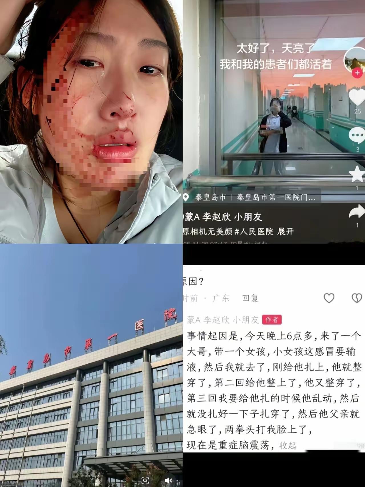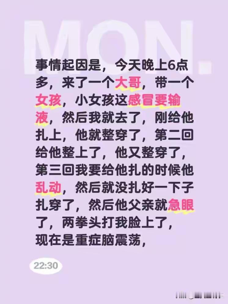 冲动是魔鬼啊! 秦皇岛的这位大哥,自己可能也没想到,自己只不过带孩子去输个液,结果就把人家小李护士给打成了重症脑震荡! 李护士给自己孩子扎上针,孩子不愿意输液,扭来扭去乱动,结果就跑针了。又给扎上了第二次,没想到又给动穿了!当小李护士给孩子扎第三针的时候,孩子还是扭来扭去,结果把血管给扎穿了! 那位爸爸一看不干了,自己孩子输个液被扎了三下,一怒之下挥拳打上了小李护士!但他那么人高马大,又急了眼 一拳下去,小李护士下巴脱臼了,脸上也破口了,还形成了重度脑震荡! 其实这件事本来很好解决!如果觉得小李护士服务不好,可以要求医院换个人扎针。或者自己好好的摁住孩子,让他配合扎针,也可能就不至于让他挨三下了! 但这位大哥偏偏选择了最愚蠢的一种做法,你扎疼了我的孩子,我得打你一顿出出气。气是出了,自己估计也要进去了。这冲动一拳的代价,自己必须要承担了!