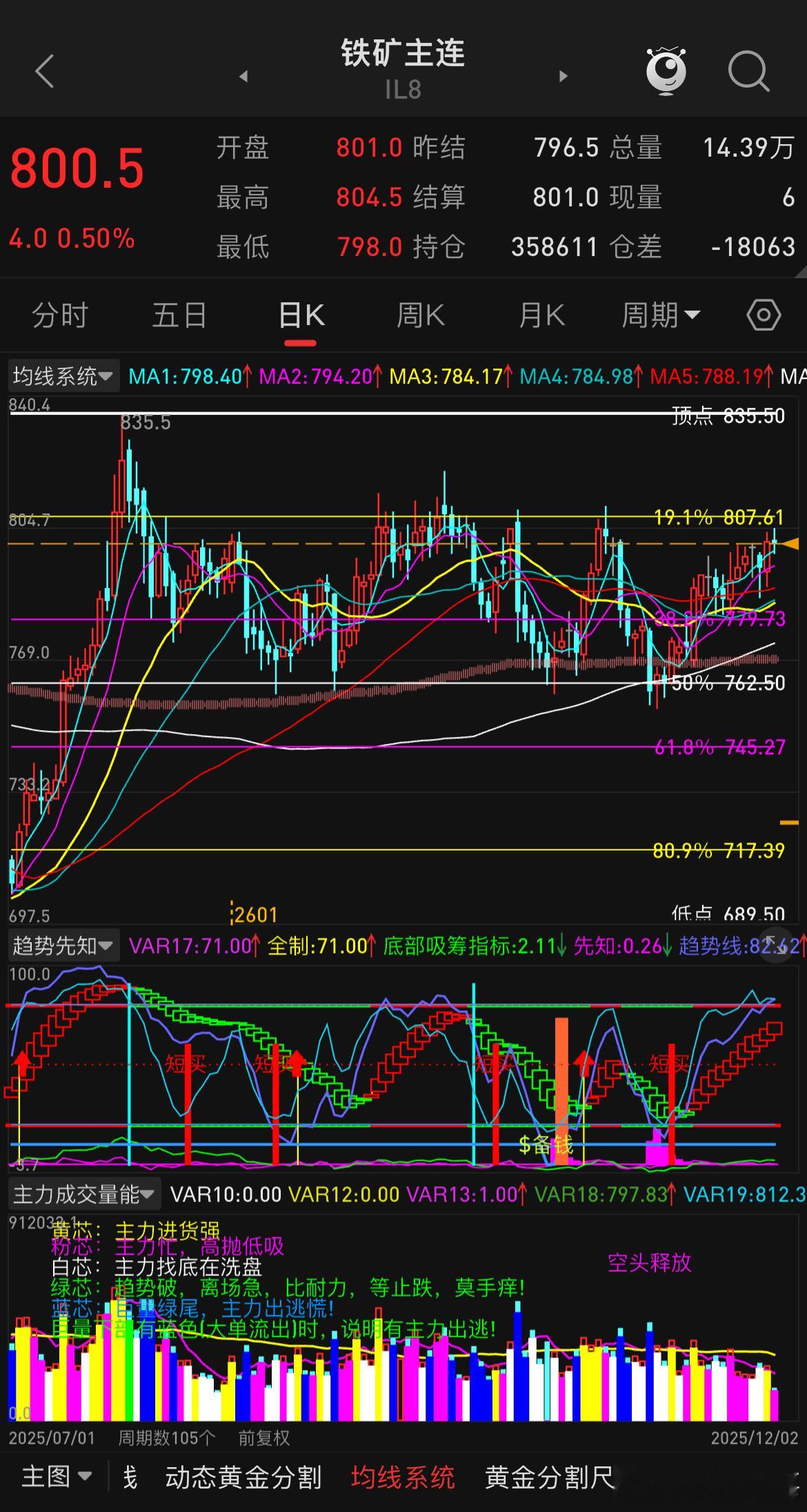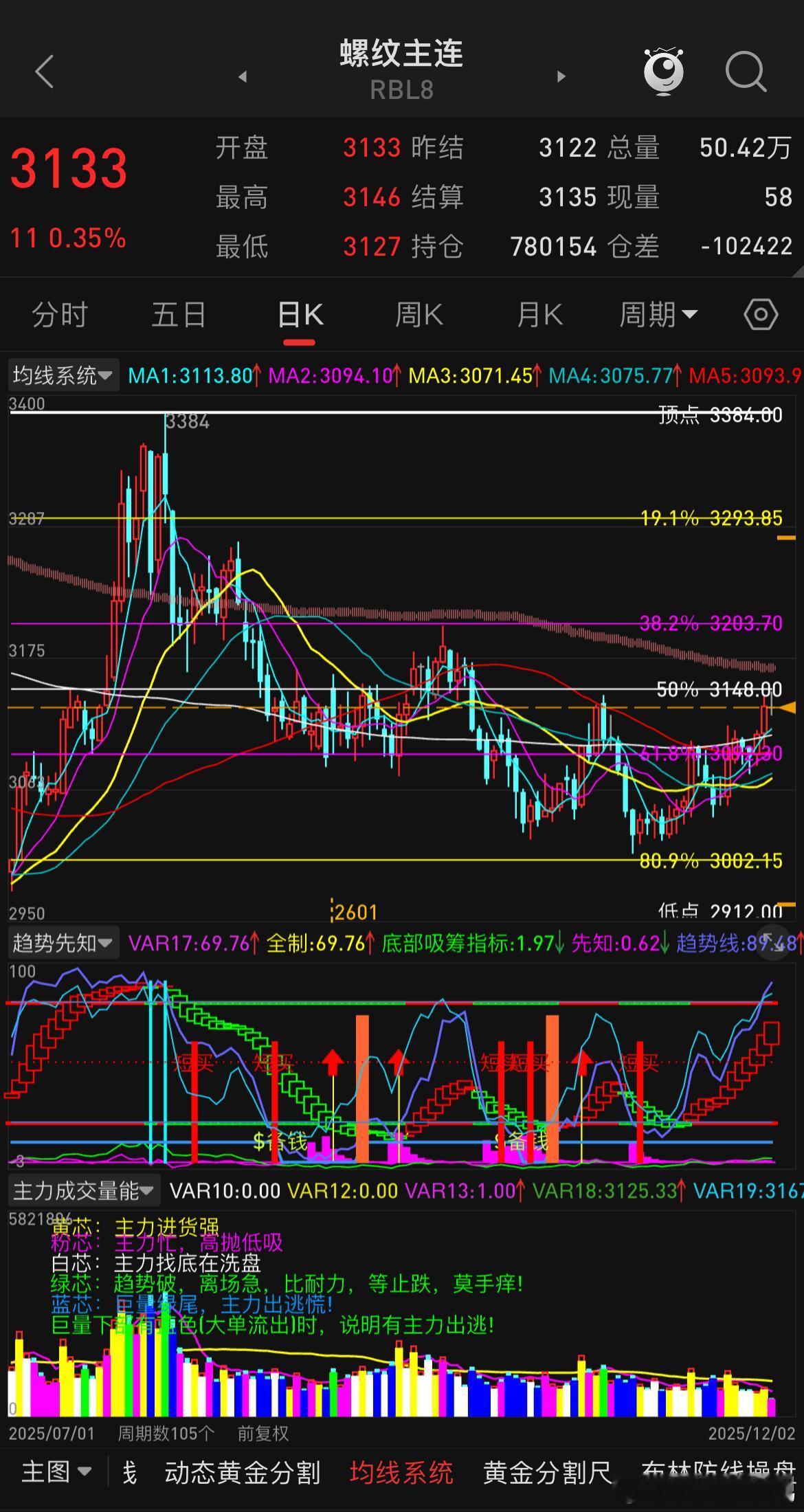 焦煤的反弹力度还是不够,看看能否站上1120附近位置再说,才有冲击1200的概率,不然还要再磨一磨。铁矿的走势比较有规律,之前也多次提过震荡区间,当下已来到800+的位置,看看反弹力度,时刻做好高空准备。螺纹下方没破3000点,目前依旧看3200附近的压制区域,虽空间不大,但走的稳点。焦煤螺纹钢铁矿石
