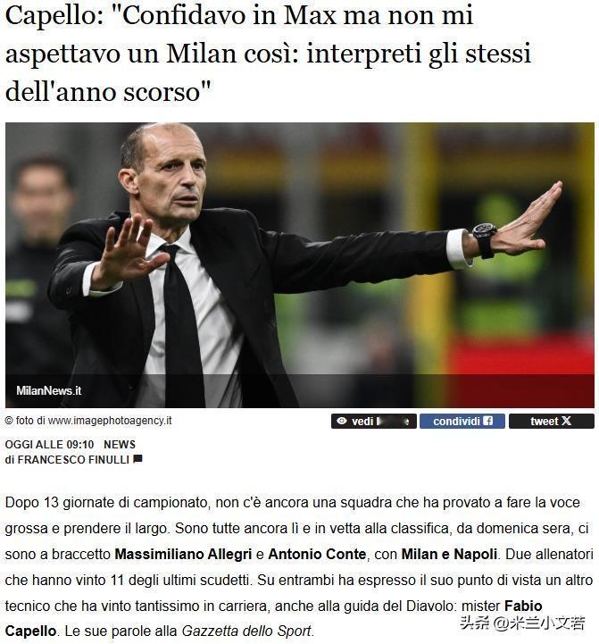 阿莱格里阵容磨合的非常好!米兰功勋主帅卡佩罗接受采访表示我从未怀疑过阿莱格里的能