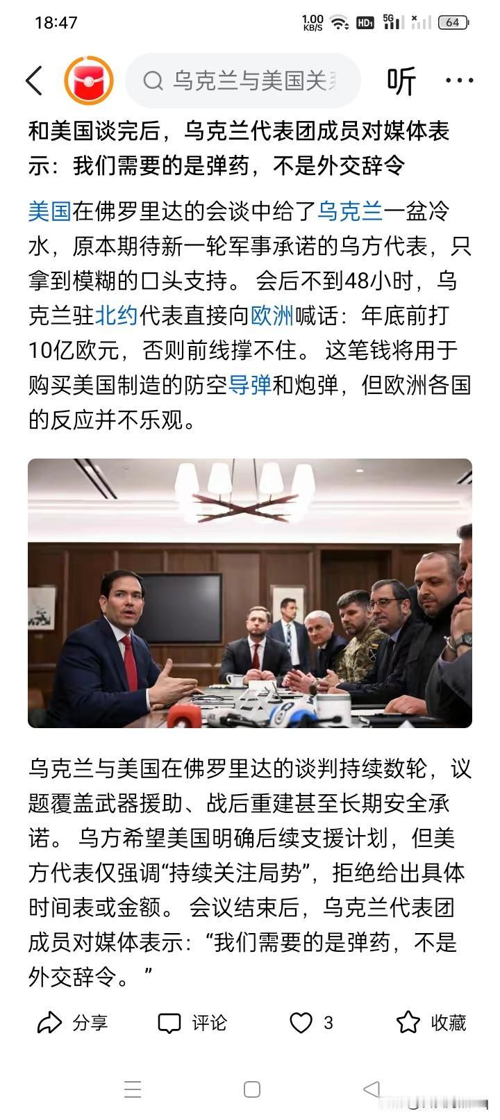 强扭的瓜不甜! 强扭的瓜不甜,估计就是有些儿童都知道。然而,好像美国的有些人连这个都不太清楚。 在乌克兰代表团与美国国务卿卢比奥为首的代表,进行如何结束乌克兰战争的谈判之后,乌克兰的一个代表团团员似乎一语道出了实情:我们需要的是弹药,而不是外交辞令。 从中差不多可以看出来,所谓的停战谈判,乌克兰不过是在不得己的情况下进行敷衍和与之周旋而已,这好像实际上就是下棋的不急,观棋的却急不可耐。 乌克兰到处残垣断壁,硝烟弥漫,鬼火四起,并且没有收复、夺回全部的领土,估计他们也没有心思与别人谈判什么结束战争,而是要顽强抵抗,坚持战斗到最后。 另外,乌克兰人也可能认为,需要停火、停战的并不是他们,而是另有其人,那才是根子和关键。庆父不除,鲁患难平。 再说,既不大力、甚至是全力支持和援助乌克兰,有什么资格对乌克兰说三道四,指点江山。