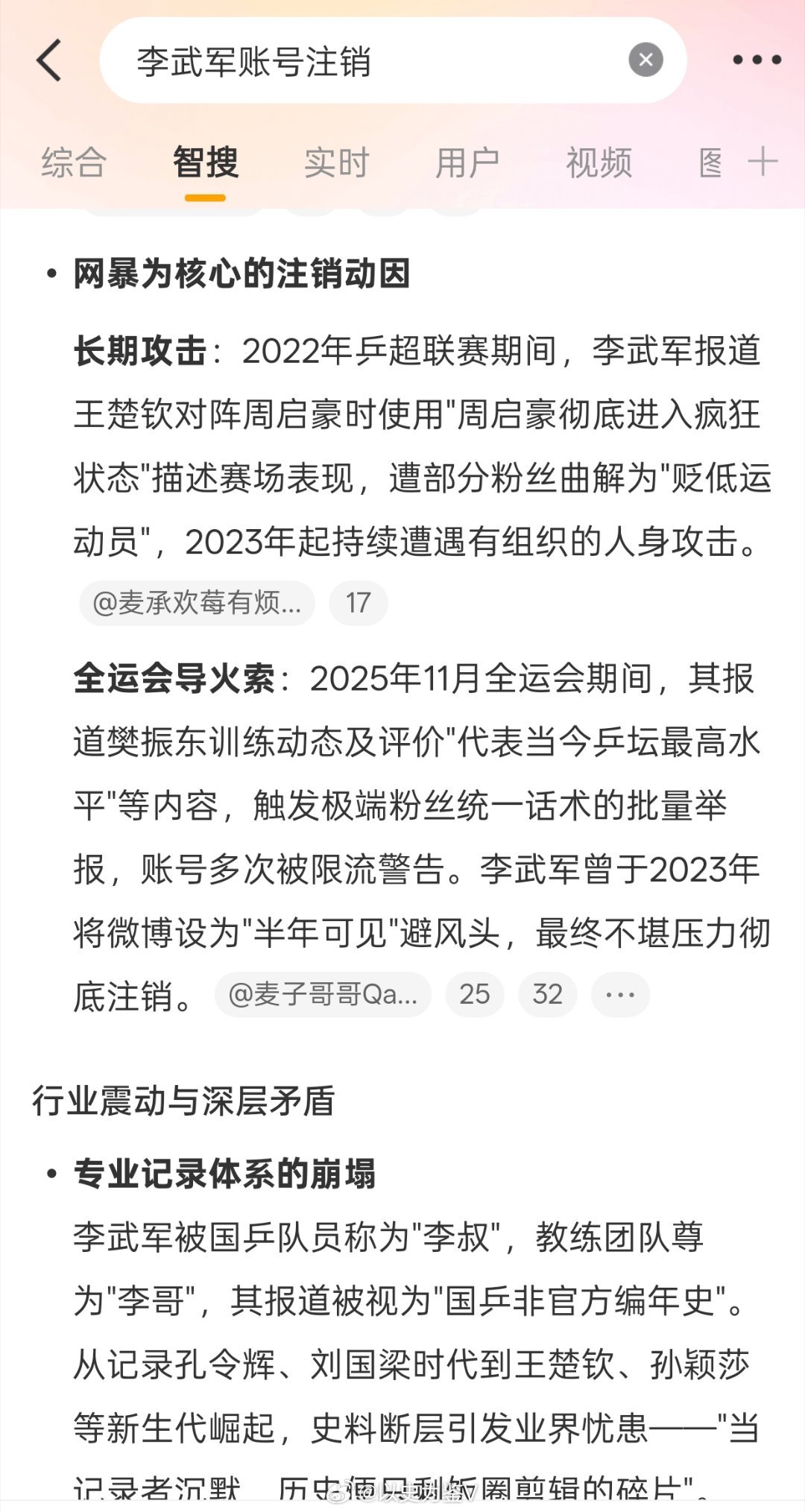 央视体育删除孙颖莎看到这个话题,又去看了一下人民系和新华系,应该是只有央视体育删掉了莎头的内容。所以以我的判断,这不是话题里面阴谋论的什么京沪之争的问题,更大的可能是和央视体育频道自己做出的决定。而央视体育最近和乒乓有关的大事件就是记者李武军注销微博。央视记者李武军注销社交账号 李老师是国乒队的老朋友,关注中国乒乓十几年,他的微博堪称中国国乒队的活历史。但是在全运会期间甚至更早,李老师就被部分极端粉丝批量举报。所以我个人觉得是李老师的遭遇让央视体育频道做出了上述决定,如果你有其他看法那就你对热点观点全网热点共创计划