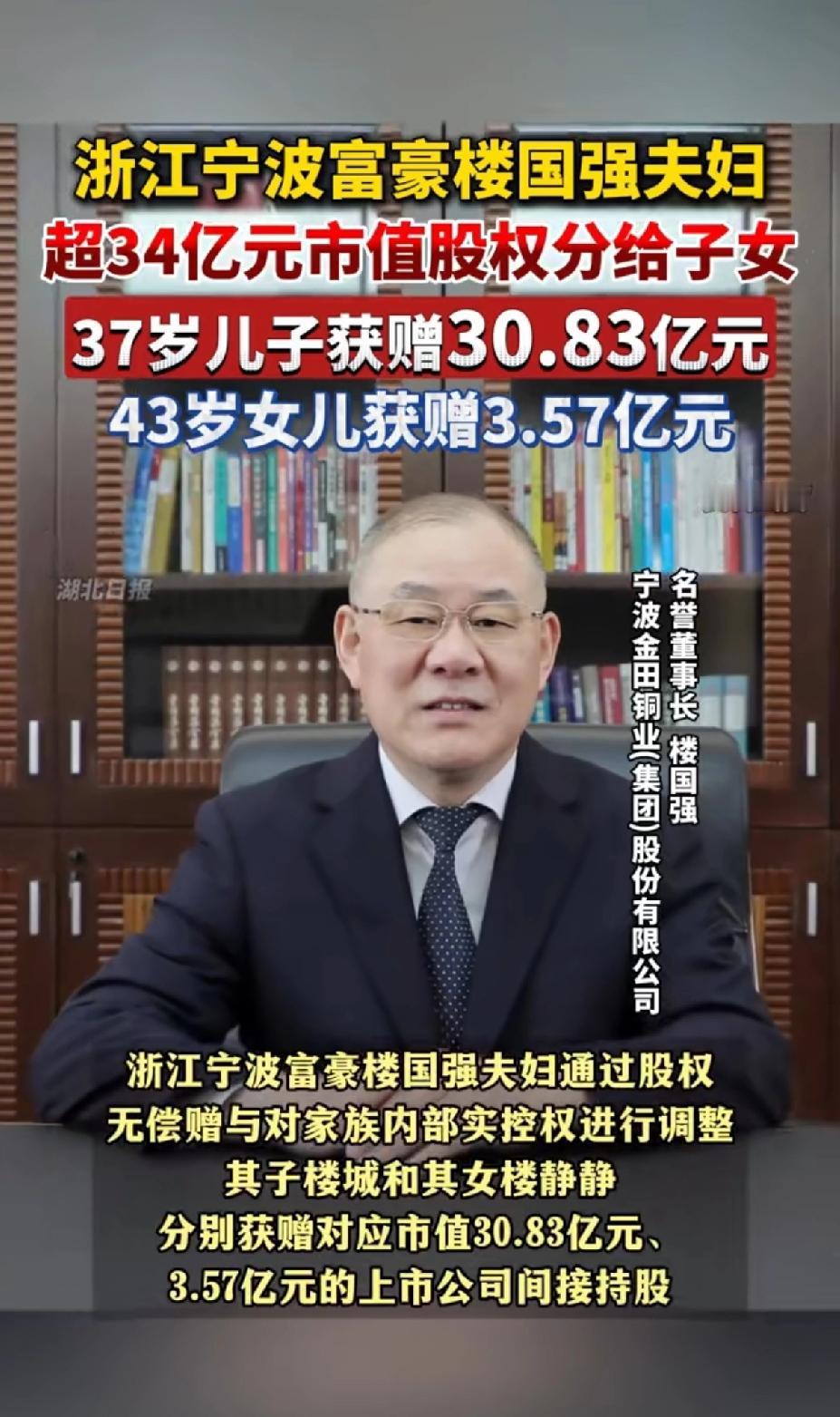 浙江宁波富豪娄国强夫妇,超34亿元市值股权分给子女。 37岁儿子获赠30.83亿元,43岁女儿获赠3.57亿元。 富人穷人都会重男轻女,如果是两个儿子股权绝对对不会这样分配。 当然给女儿的也不少,多少也公开了。不像普通老百姓私下分配不公,对外宣称一碗水端平,儿子女儿都一样。