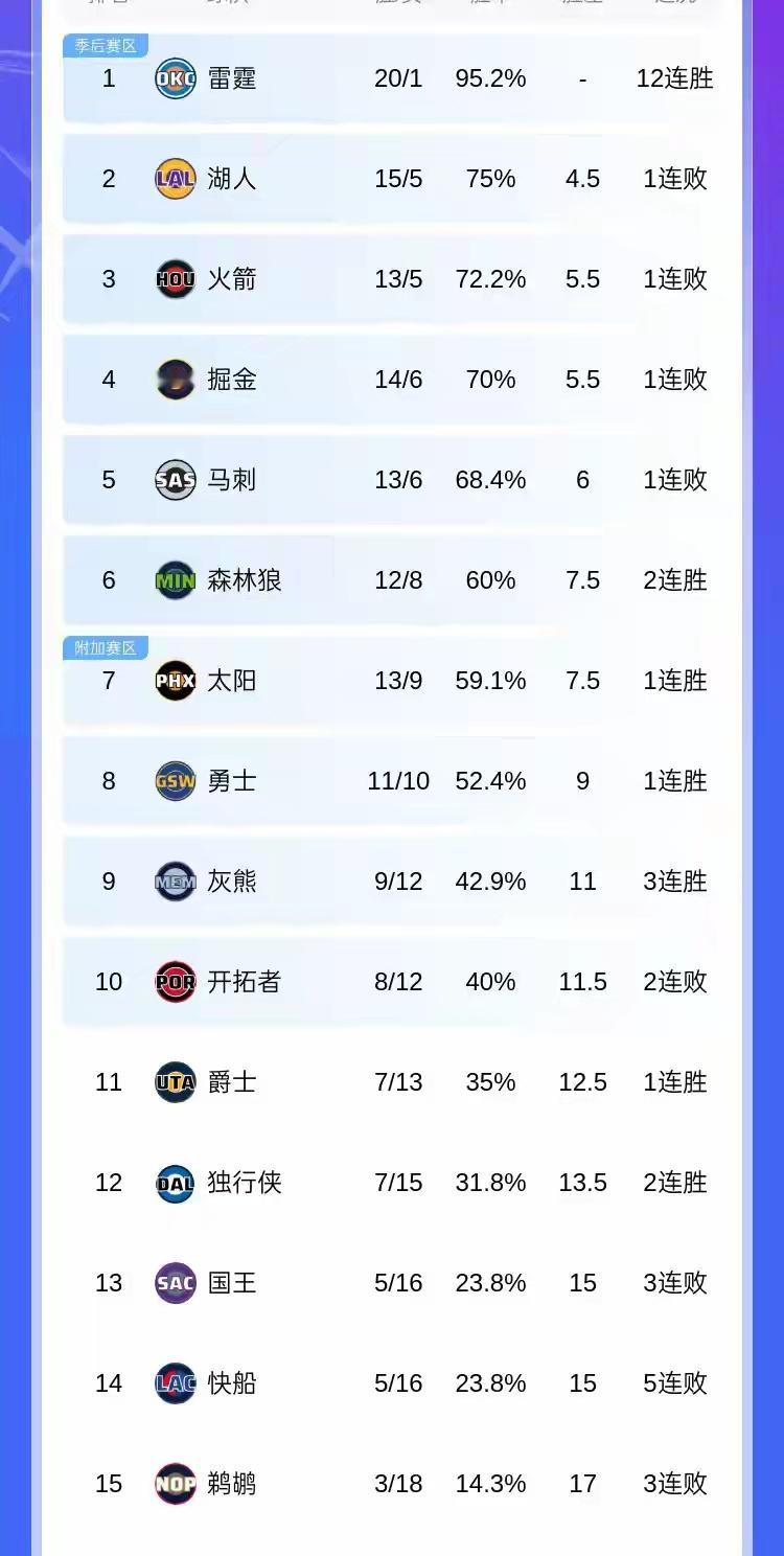 湖人,火箭,掘金集体翻车,西部最新排名出炉: 2-7名仅差3场 上演白热化卡位战nba 北京时间12月2日,NBA西部赛场迎来“集体翻车日”:豪取七连胜的湖人主场遭太阳击溃,手握三连胜的火箭被爵士逆转,稳居前四的掘金遭独行侠17分大翻盘。三大豪强同日输球引发排名剧烈洗牌,雷霆继续领跑的同时,西部2-7名球队胜场差仅缩至3场,季后赛席位争夺提前进入白热化阶段。作为当日最大冷门之一,湖人在主场108-125不敌太阳,七连胜势头戛然而止。尽管东契奇狂砍38分11篮板5助攻的豪华数据,詹姆斯延续1297场得分上双的纪录,但球队第二节单节仅得21分,攻防体系全面崩盘。太阳则凭借迪龙33分、吉莱斯皮28分的爆发,外线投出48%的三分命中率,用流畅的团队篮球终结了湖人的连胜势头。火箭与爵士的对决上演极致反转,这场对攻大战中,火箭申京交出31分8篮板14助攻的准三双,杜兰特末节狂砍16分,阿门贡献23分8篮板,三人合砍86分仍难挽败局。爵士这边马尔卡宁29分、乔治28分、努尔基奇18分,三核联手轰下85分,末节更是凭借一波“三分雨”在3分钟内拉开分差,最终以133-125逆转取胜,终结火箭三连胜。掘金的境遇同样悲情,约基奇打出29分20篮板13助攻的史诗级三双,却沦为独行侠逆转的背景板。独行侠在一度落后17分的情况下,依靠戴维斯32分13篮板、内姆哈德28分10助攻、弗拉格24分8篮板的三核爆发,末节打出27-10的窒息攻势,以131-121完成大翻盘,而掘金核心穆雷末节沉寂仅得2分,成为比赛重要转折点。三大豪强同日输球后,西部最新排名格局彻底重塑:雷霆以20胜1负的战绩豪取12连胜,凭借4个胜场差的优势稳坐榜首,亚历山大与霍姆格伦的内外双核展现出极强统治力;湖人虽止步七连胜,但仍以16胜5负守住西部第二;火箭、马刺、掘金、太阳、森林狼、勇士依次位列3-8名,其中2-7名球队胜场差仅为3场,每一场比赛的结果都可能改变排名顺序。