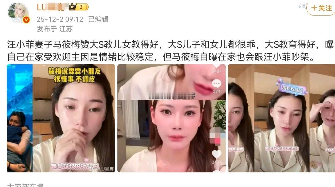 马筱梅竟然公开夸赞大S把孩子教育得很好! 这话从汪小菲现任女友嘴里说出来,简直让人不敢相信自己的耳朵。 就在去年,张兰还在直播间斩钉截铁地说大S“一天孩子都没带过”,汪小菲更是直接指责前妻“天天躺家里不管孩子”,连“保姆更像孩子亲妈”这种话都说出来了。 两边的说法天差地别,总有一方在说谎吧? 有台湾媒体去年12月拍到两个孩子和大S一起出门的画面,兄妹俩全程乖巧地跟在妈妈身边,举止特别得体。 教育专家王浩威也分析过,从公开影像看,两个孩子确实受到了良好的家庭教育。 这不就印证了马筱梅的说法吗? 现在最尴尬的怕是张兰了,自家准儿媳居然站到了对面阵营。 这事真让人越想越有意思,你觉得马筱梅这话是真心夸赞,还是另有深意? 评论区聊聊你的看法!
