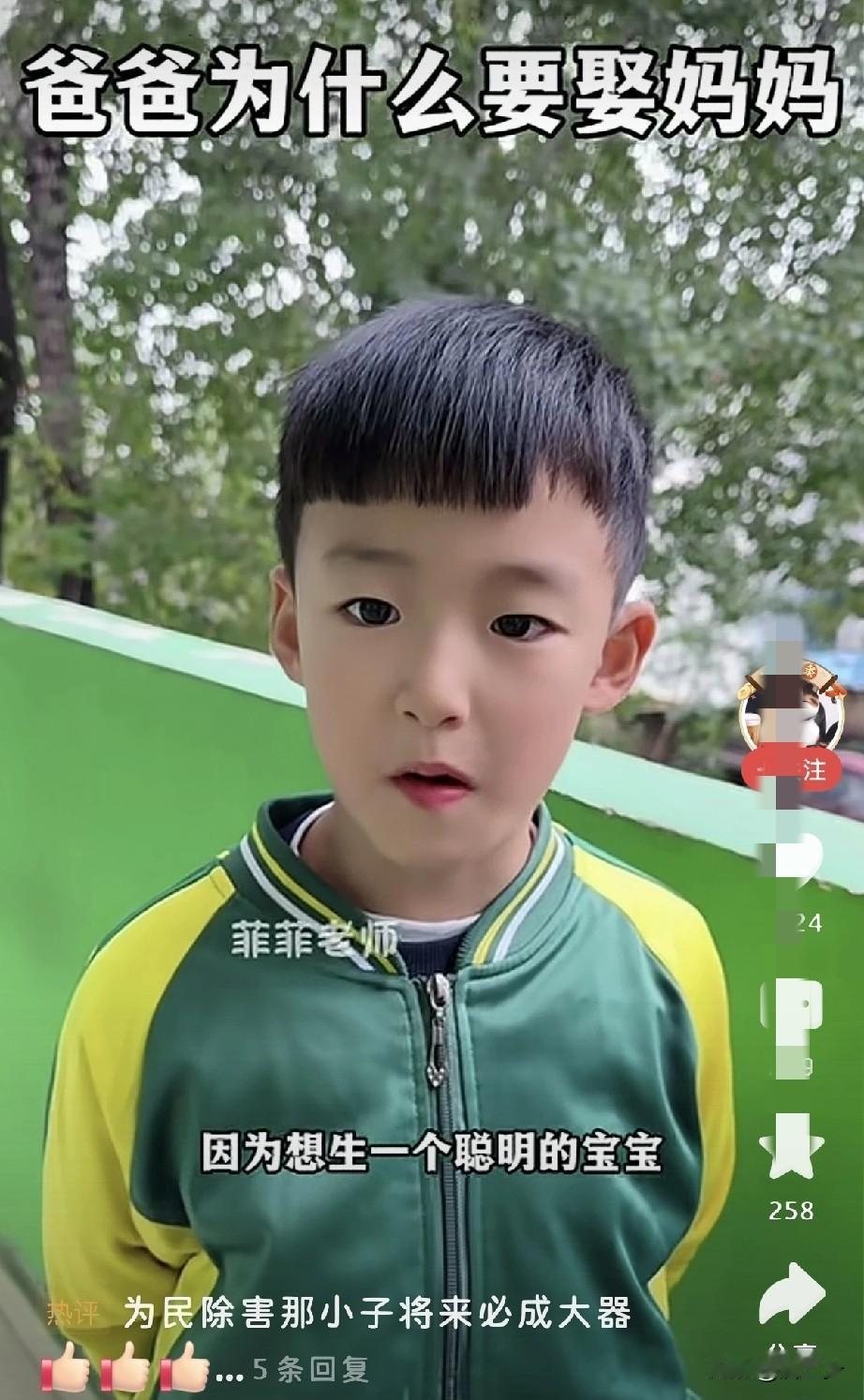 “笑不活了[捂脸]”!幼儿园老师问小朋友:爸爸为什么要娶妈妈?结果让人想不到的是小朋友们的回答真是五花八门,让人想不笑都难! 老师:爸爸为什么娶妈妈? 小朋友1:因为我爸爸眼神不好!(这个小朋友肯定超级爱爸爸[捂脸],估计平时没少嫌弃妈妈) 小朋友2:我爸爸娶我妈妈,是为民除害。(好一个漏风皮夹克[笑哭]) 小朋友3:因为我爸爸想要一个聪明的宝宝,要不然哪有我?(这个宝宝真是超级自恋呀[捂脸]) 小朋友4:因为爸爸当年不是人。(这个宝宝扎心了[尬笑],当年你爸不是人,估计生米煮成熟饭了,你妈没有选择[呲牙][呲牙][呲牙][呲牙]) 小朋友5:因为爸爸不想当和尚。(所以勉为其难娶了妈妈,是这样理解吧[笑哭]) 小朋友6:因为妈妈看爸爸可怜。(所以勉为其难的嫁给了爸爸[尬笑]) …… 小朋友真是童言童语,让人听了不由得会心一笑。 由此可见,孩子是什么样的,真的跟父母有很大关系! 我也想问问我家孩子,你们猜他会咋说?