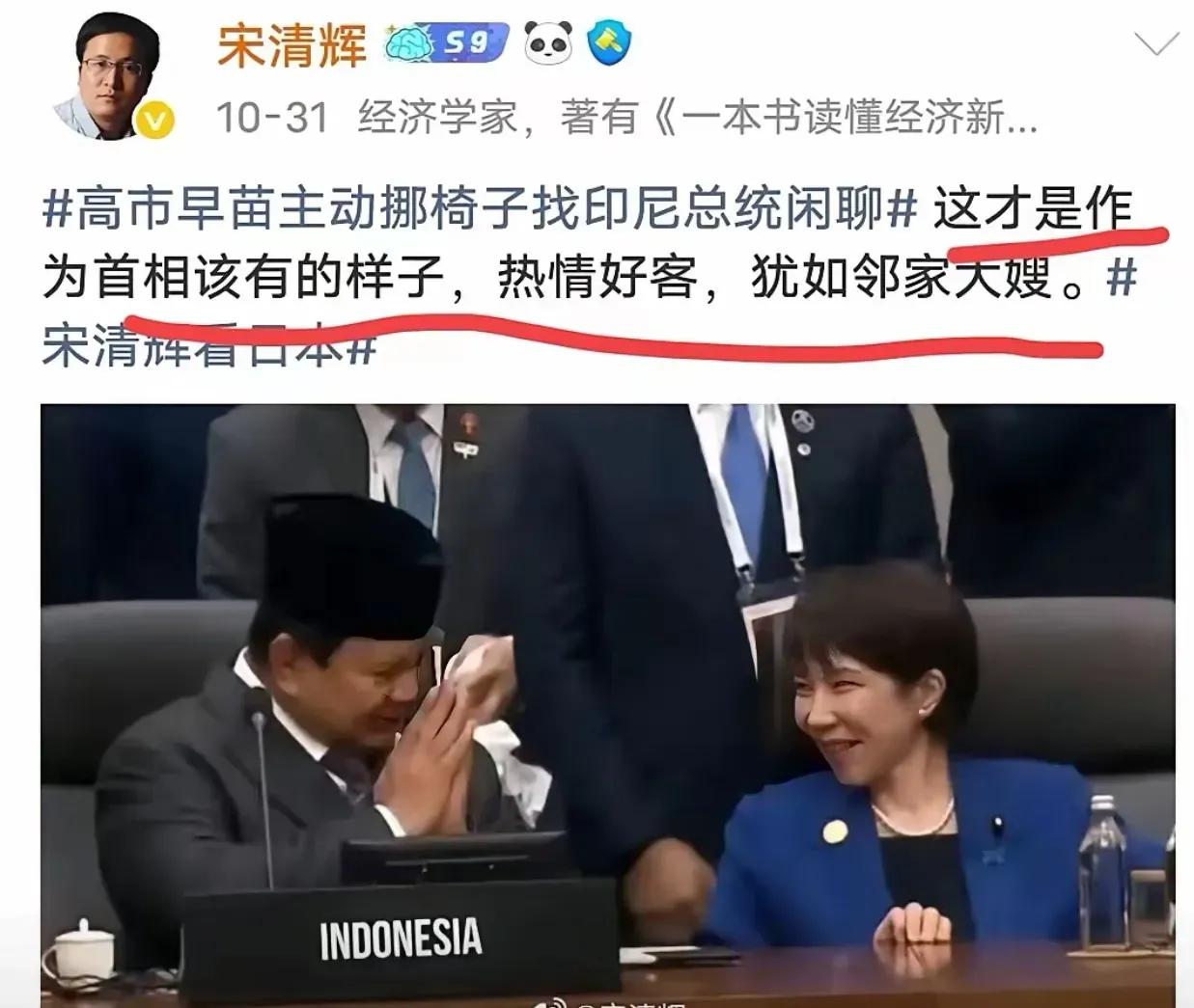 宋清辉作为经济学家,这样评价日本首相高市早苗在g20会议上表现,思维方法是有问题的。 他看问题、评价人,抓不住重点。抓了芝麻 ,忘了西瓜,把次要的当成主要的,把非重点当成了重点。 不仅如此,宋清辉的思维有时很独特,也可以说有时很奇葩,好像他不食人间烟火,生活在真空中。 他看问题,评价人,有时他好像他不是中国人,从来不考虑国家利益,胳膊肘往外拐。 日本高市早苗在台湾问题上发表侵犯中国主权和领土完整的言论。 它还不知悔改,又扯出什么“旧金山和约”,说什么“台湾地位未定论”。 对这样的不讲信用、出尔反尔、睁眼说瞎话的政府官员,你宋清辉还夸她是热情好客邻家大嫂了,你什么眼神,根本不是那回事。 看看你宋清辉对高市早苗的评价,说他是“热情好客,邻家大嫂”,殊不知这是高市早苗开会迟到了,在主动道歉! 平台禁言了宋清辉的微博,就说明了他的言论有问题。