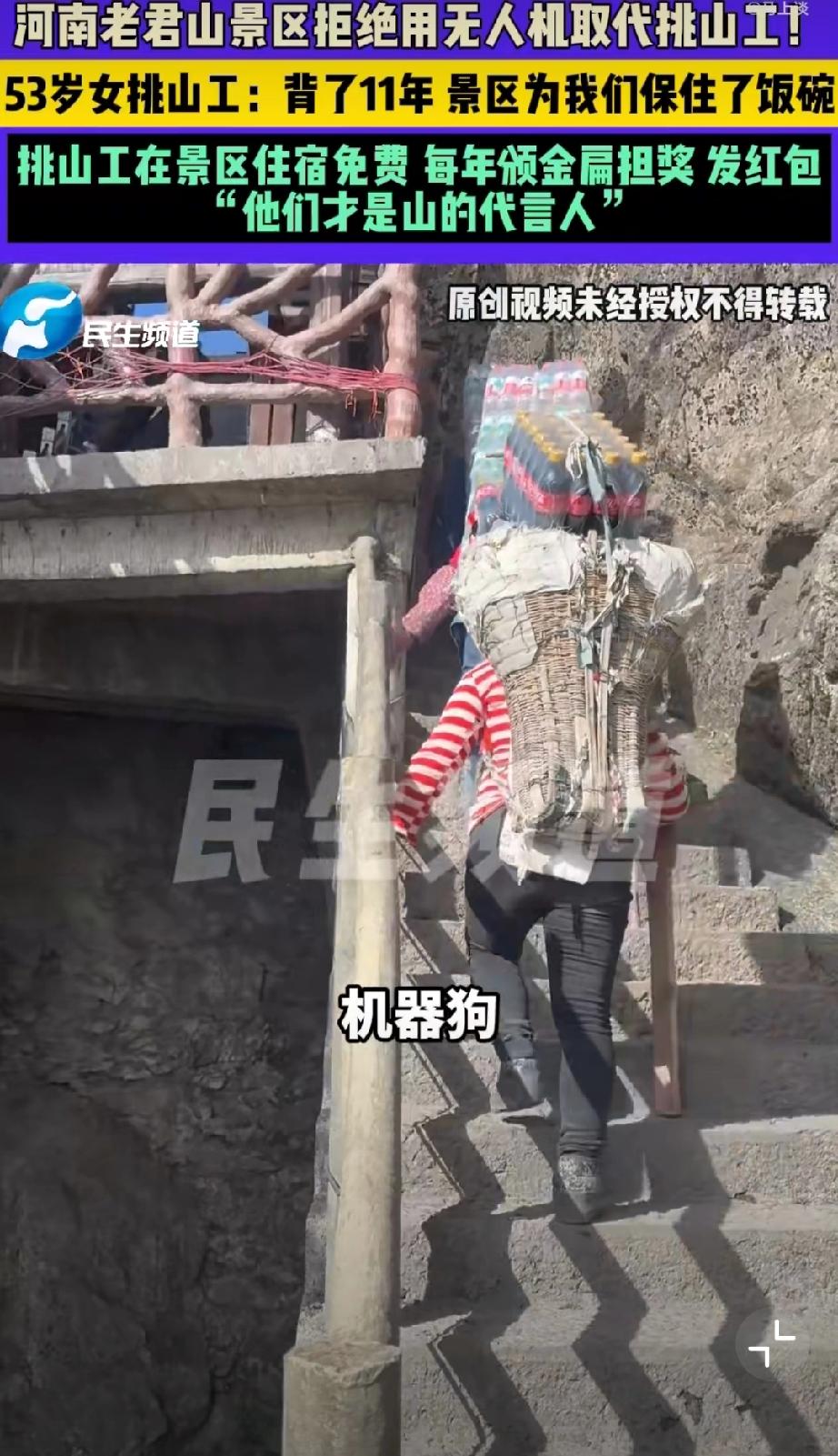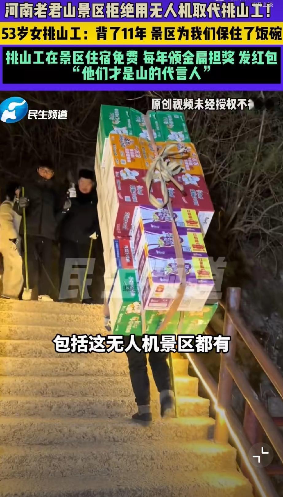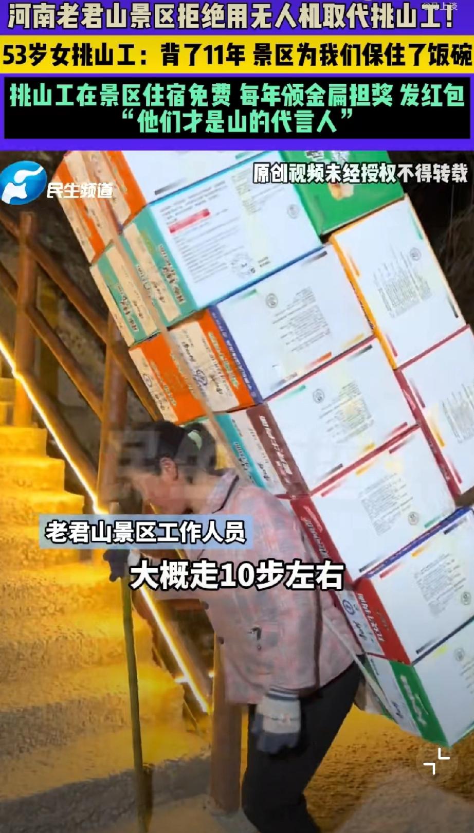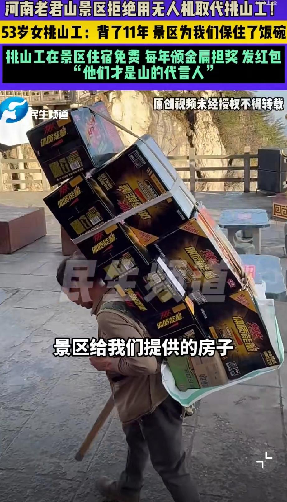 河南洛阳老君山景区拒绝用无人机取代挑山工,53岁女挑山工:背了11年,感谢景区为我们保住了饭碗,提供免费住宿,每年还颁金扁担奖和红包。高新科技在给人们生活带来便利的同时,也大量取代很多人的工作岗位。在没有实现共产之前,我们应该尽力提供更多一些的公益和保障就业机会。点赞老君山景区,值得大家一去。[赞][赞][赞] 河南身边的事情