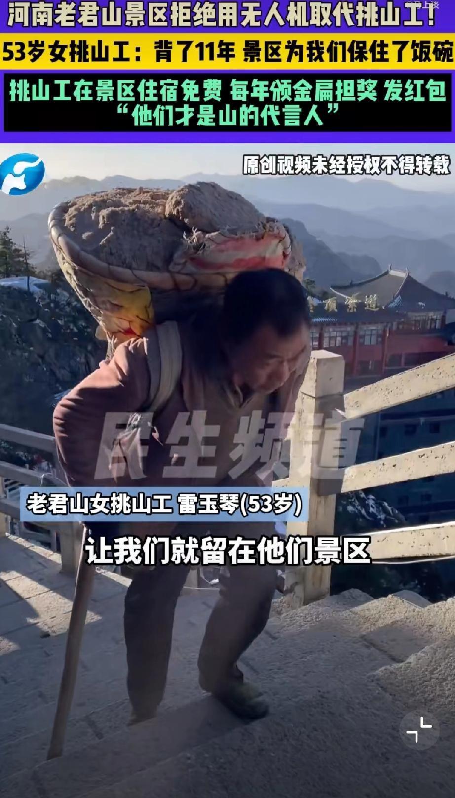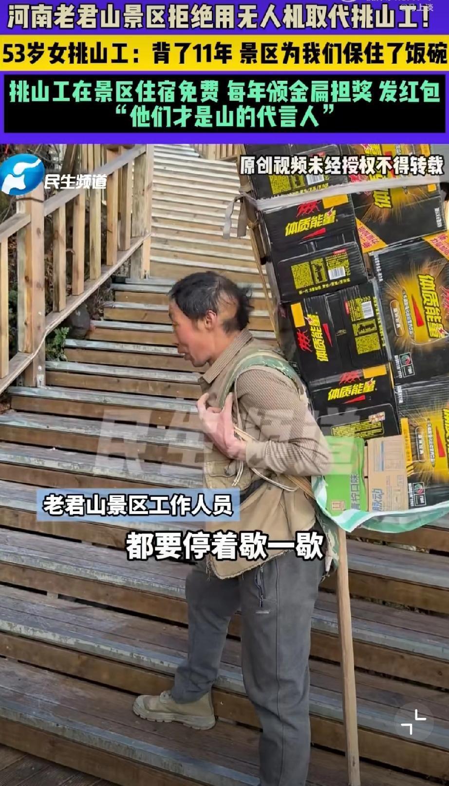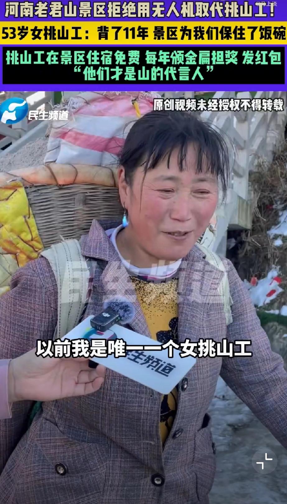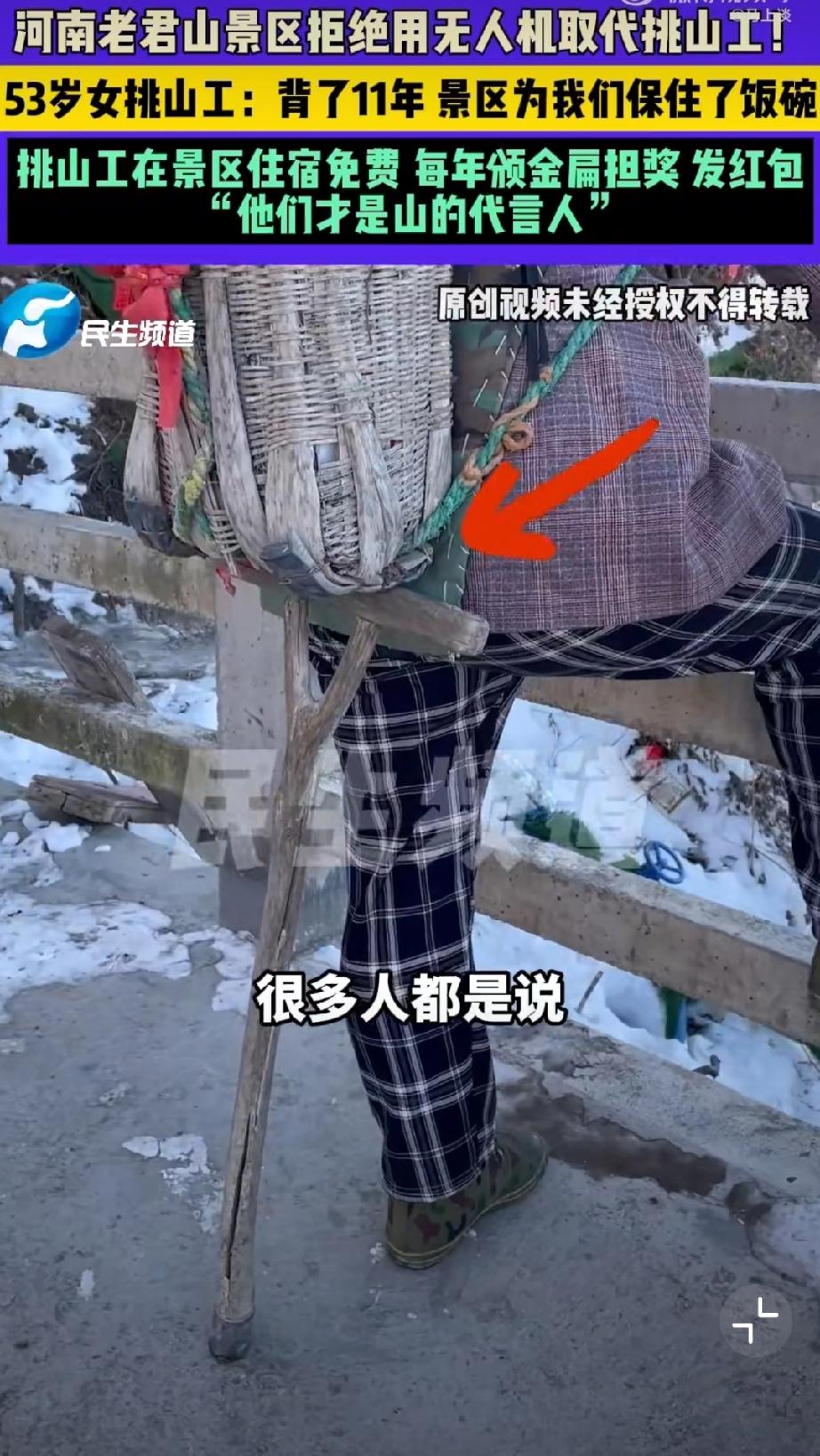 河南洛阳老君山景区拒绝用无人机取代挑山工,53岁女挑山工:背了11年,感谢景区为我们保住了饭碗,提供免费住宿,每年还颁金扁担奖和红包。高新科技在给人们生活带来便利的同时,也大量取代很多人的工作岗位。在没有实现共产之前,我们应该尽力提供更多一些的公益和保障就业机会。点赞老君山景区,值得大家一去。[赞][赞][赞] 河南身边的事情