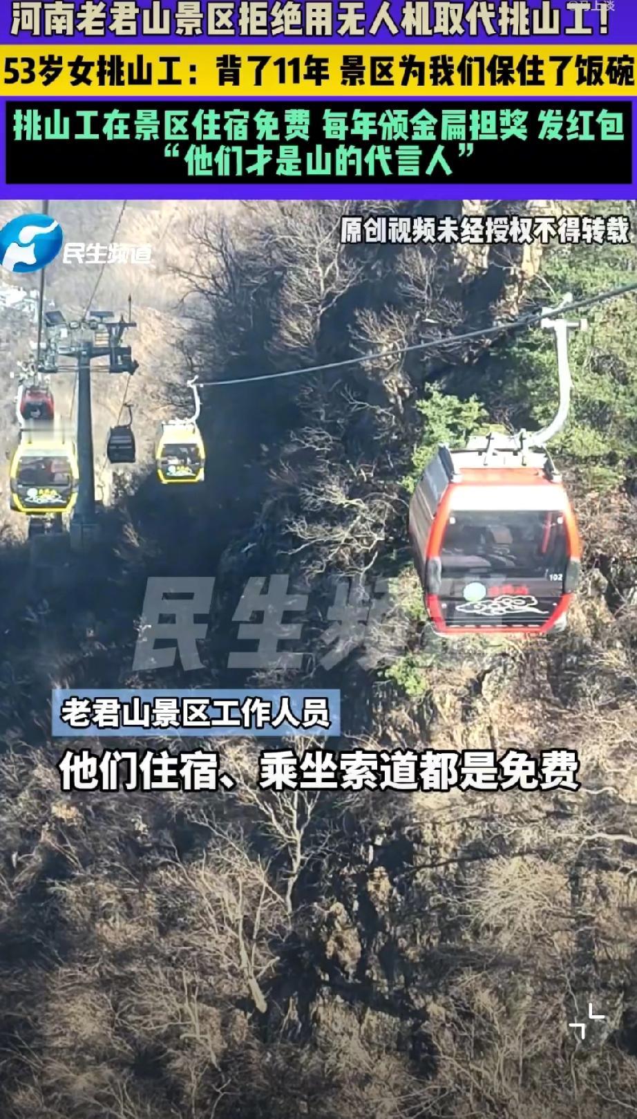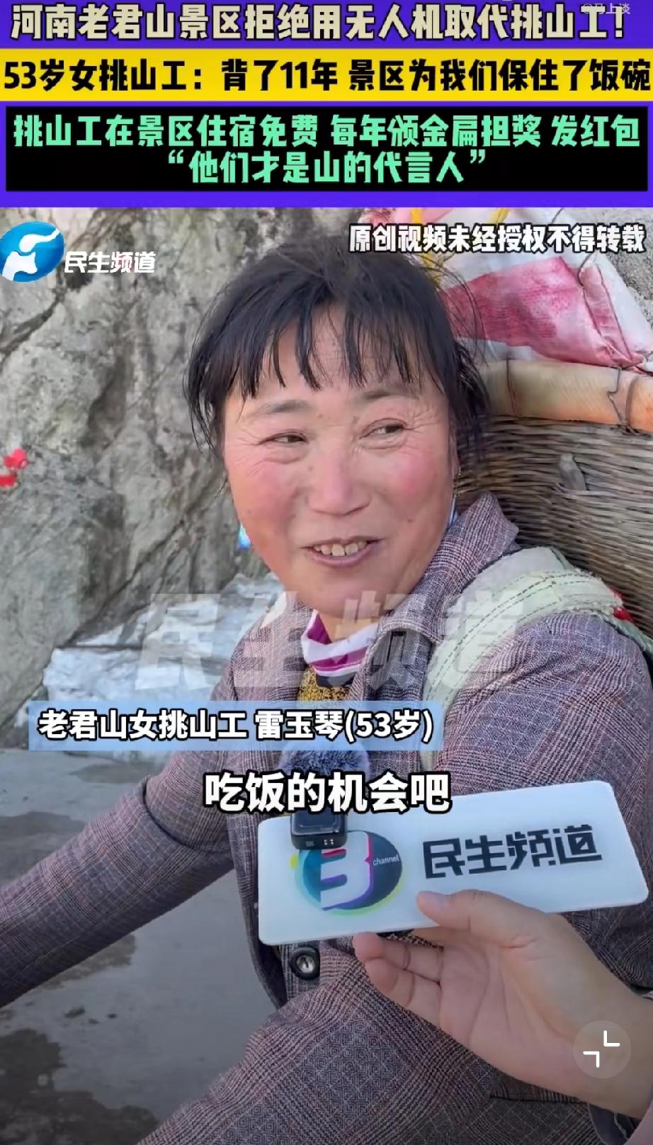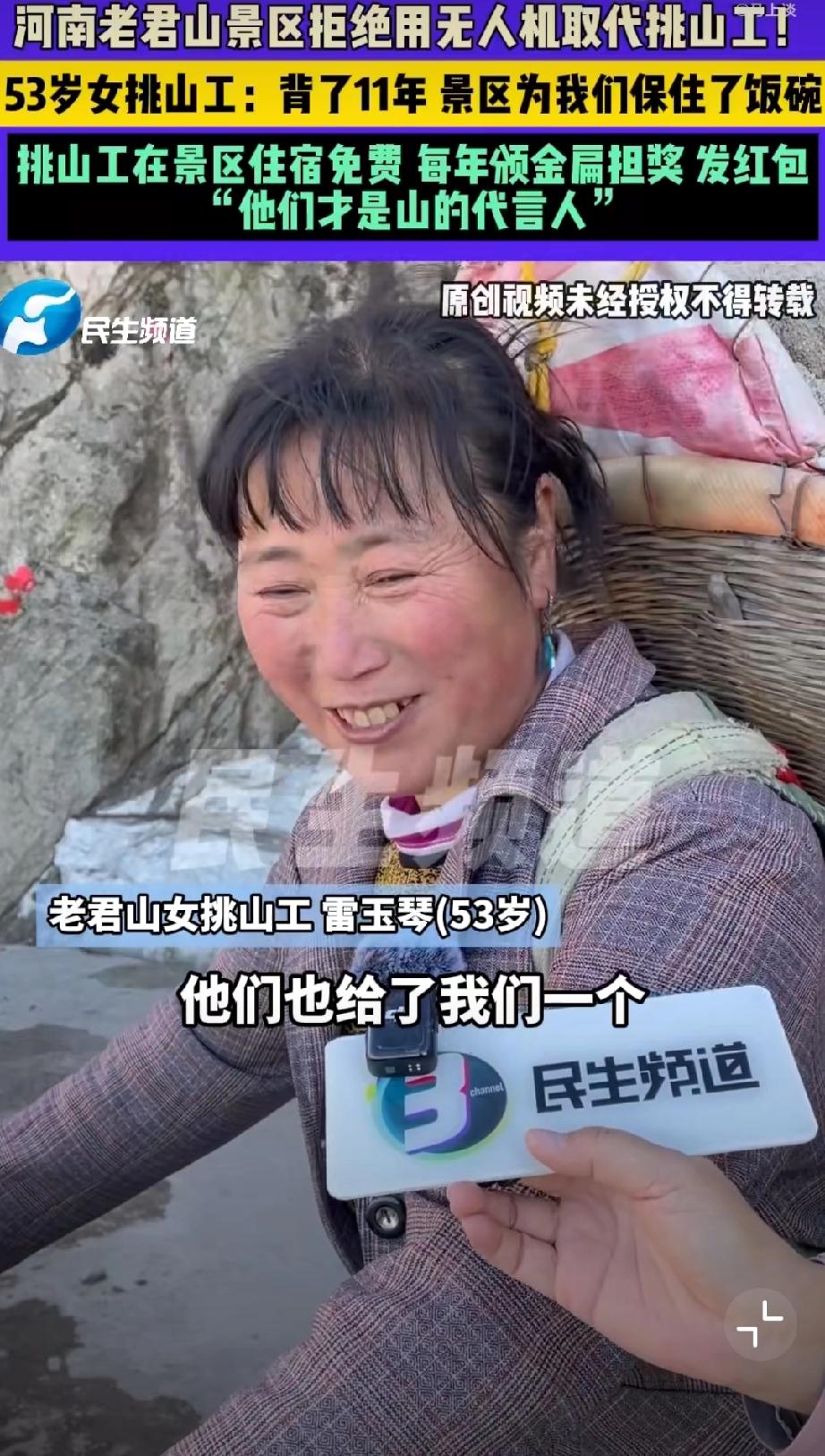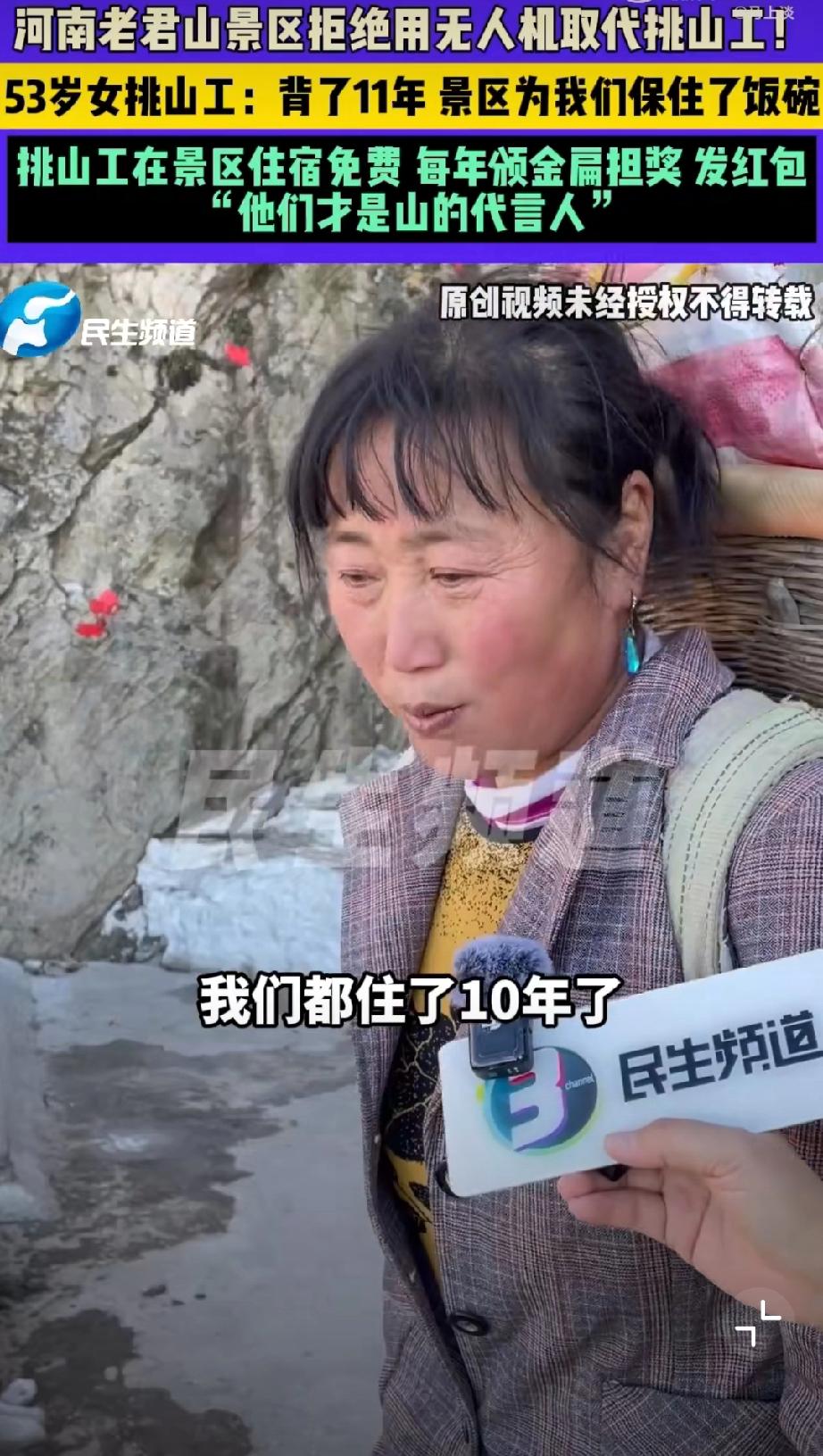 河南洛阳老君山景区拒绝用无人机取代挑山工,53岁女挑山工:背了11年,感谢景区为我们保住了饭碗,提供免费住宿,每年还颁金扁担奖和红包。高新科技在给人们生活带来便利的同时,也大量取代很多人的工作岗位。在没有实现共产之前,我们应该尽力提供更多一些的公益和保障就业机会。点赞老君山景区,值得大家一去。[赞][赞][赞] 河南身边的事情