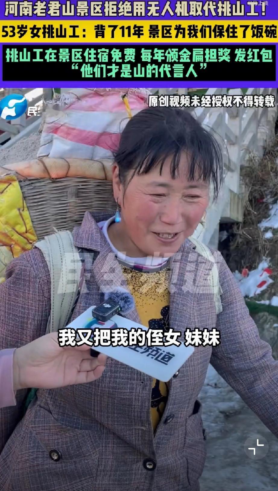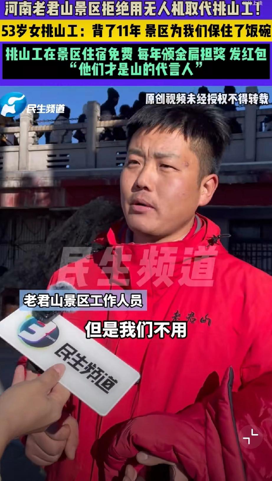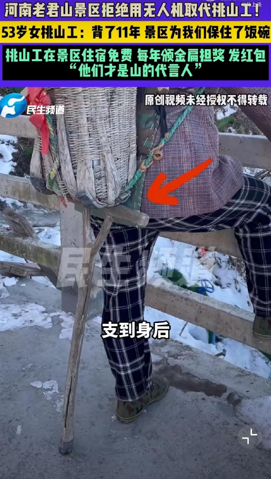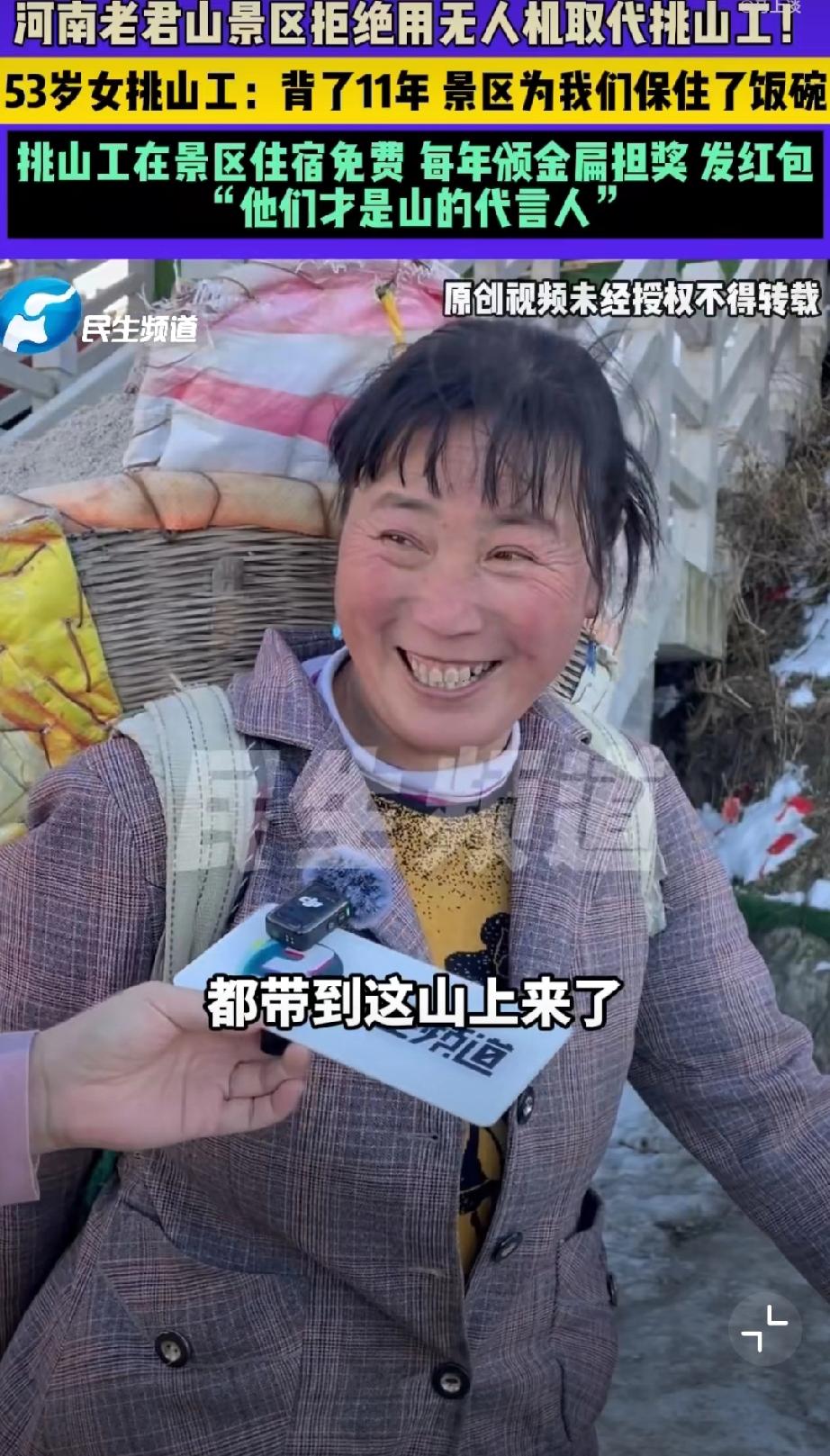 河南洛阳老君山景区拒绝用无人机取代挑山工,53岁女挑山工:背了11年,感谢景区为我们保住了饭碗,提供免费住宿,每年还颁金扁担奖和红包。高新科技在给人们生活带来便利的同时,也大量取代很多人的工作岗位。在没有实现共产之前,我们应该尽力提供更多一些的公益和保障就业机会。点赞老君山景区,值得大家一去。[赞][赞][赞] 河南身边的事情