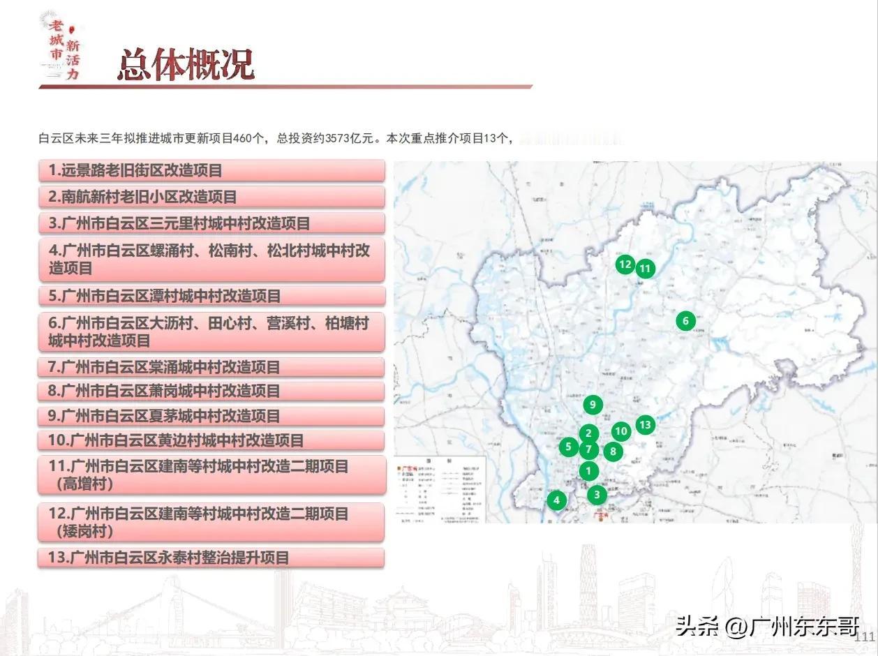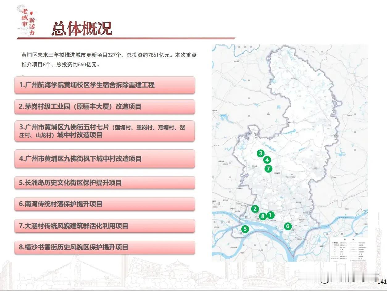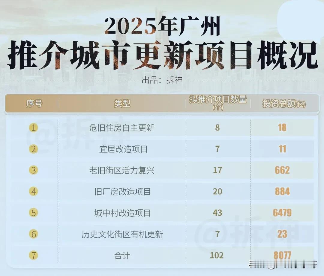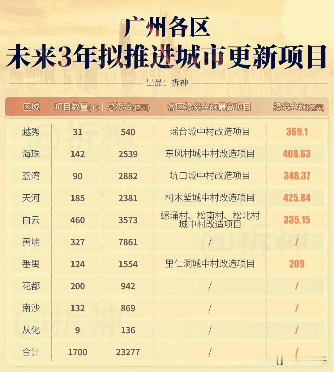 2.3万亿!未来三年广州投入巨资进行城市更新改造! 进入改造的项目中,数量最多的是白云区460个,投资金额最高的是黄埔区7861亿,这两个地方或许将成为旧改主战场。 重点列出推介的项目,也是各区未来重点发展方向,钱流向哪里,机会就在哪里。比如荔湾聚龙湾、新中轴海珠段,白云罗冲围、白云新城、越秀瑶台等区域也要彻底换面了。 项目如此之多,改造时间也会有先后,改造重点也会有所不同,未能进入本次推介的旧改,就不是那么紧迫,推进速度和力度也会落后上述区域。 投入资金如此之大,钱从何来?主要是引入社会资本和国企主导的做地新模式,通过发行专项债和专项借款来筹措。 通过城更改造,不仅能有效提升低效用地,还能推动产业升级和城市界面改善,更重要的是可以带动GDP,在广州工业仍处于低迷情况下,旧改已经成为广州经济不可或缺的一环。