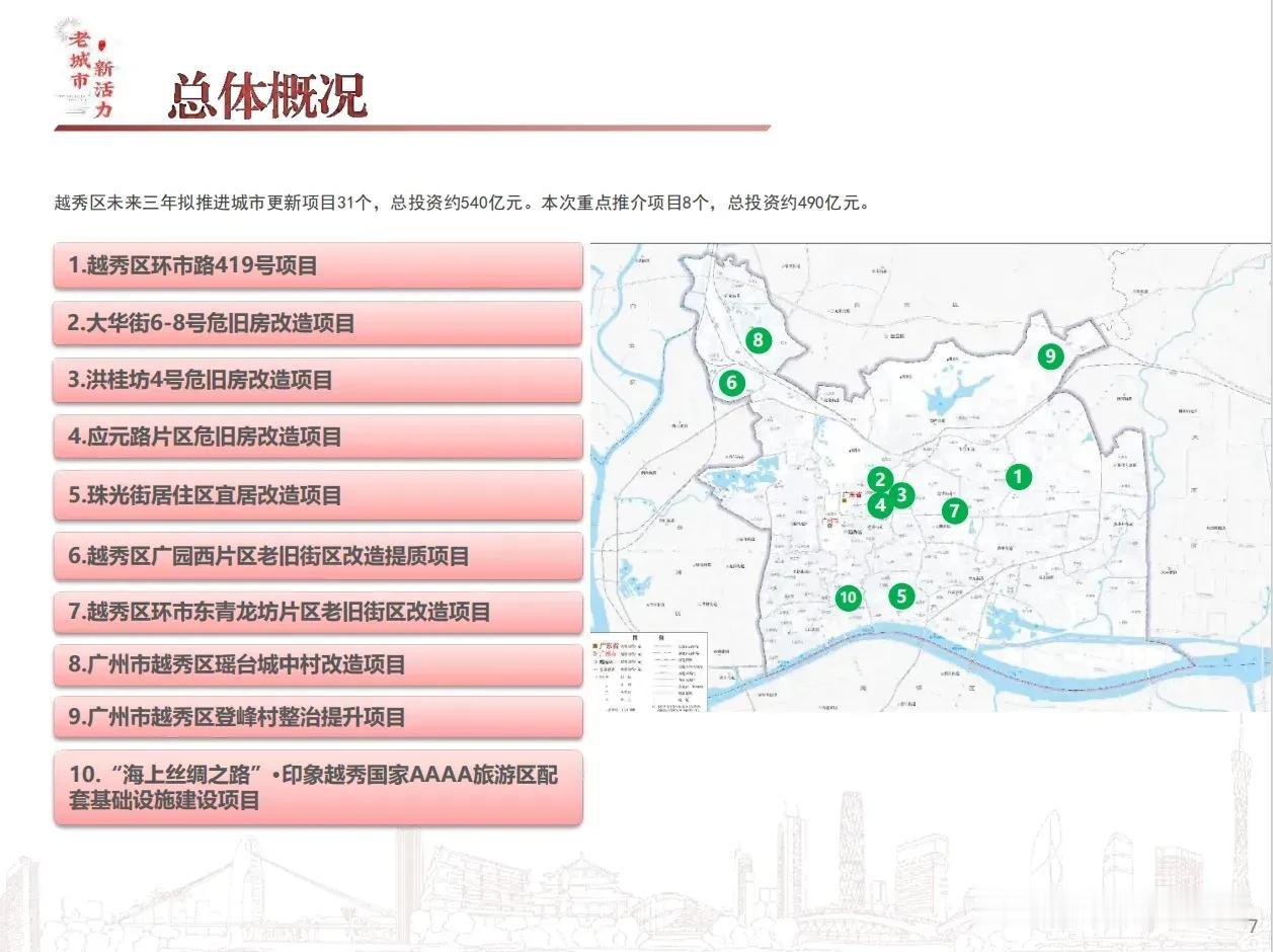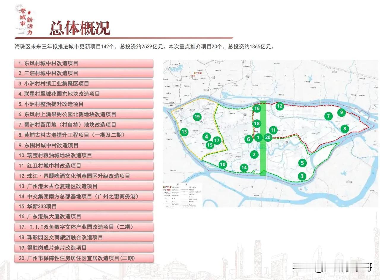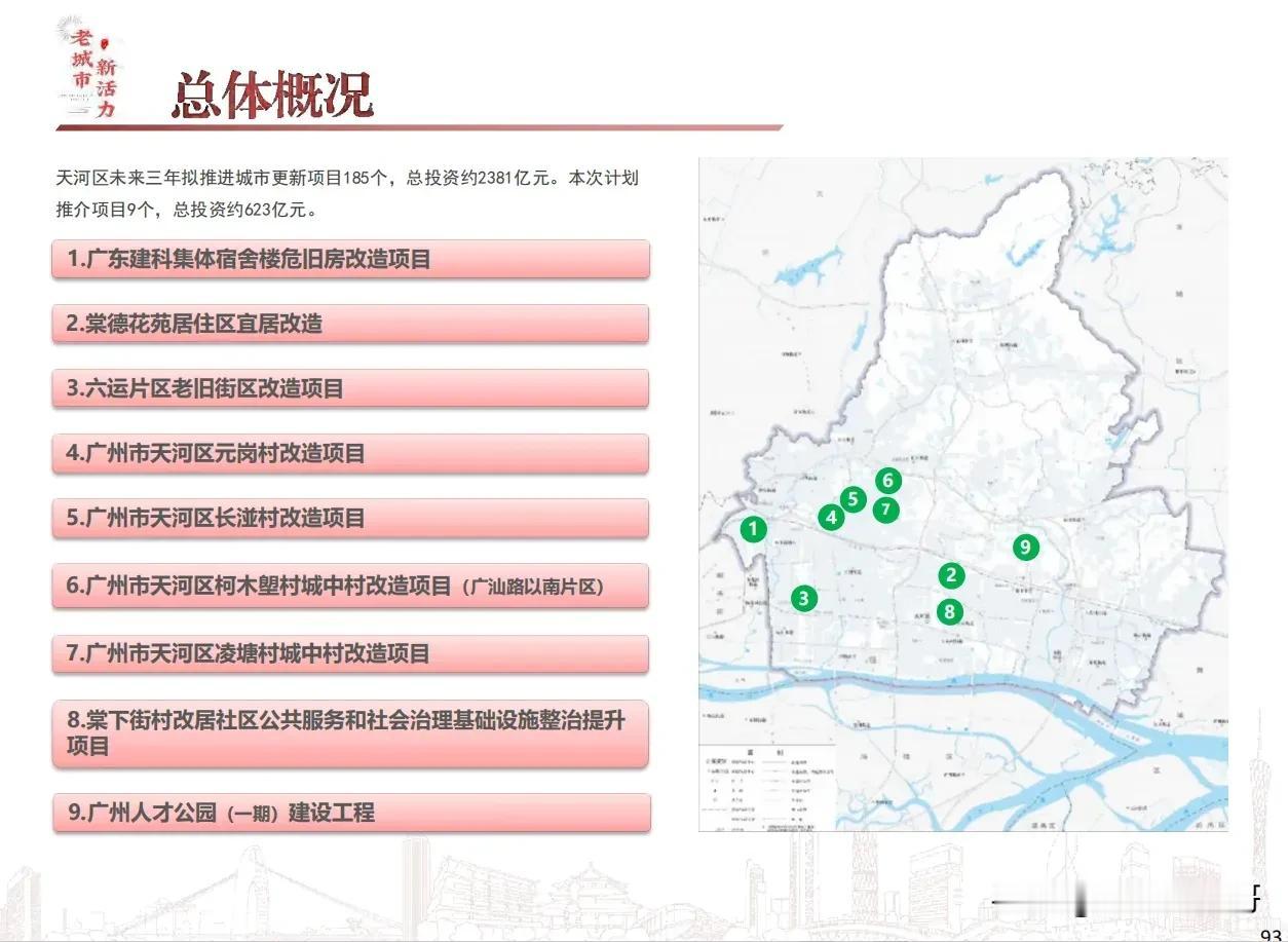 2.3万亿!未来三年广州投入巨资进行城市更新改造! 进入改造的项目中,数量最多的是白云区460个,投资金额最高的是黄埔区7861亿,这两个地方或许将成为旧改主战场。 重点列出推介的项目,也是各区未来重点发展方向,钱流向哪里,机会就在哪里。比如荔湾聚龙湾、新中轴海珠段,白云罗冲围、白云新城、越秀瑶台等区域也要彻底换面了。 项目如此之多,改造时间也会有先后,改造重点也会有所不同,未能进入本次推介的旧改,就不是那么紧迫,推进速度和力度也会落后上述区域。 投入资金如此之大,钱从何来?主要是引入社会资本和国企主导的做地新模式,通过发行专项债和专项借款来筹措。 通过城更改造,不仅能有效提升低效用地,还能推动产业升级和城市界面改善,更重要的是可以带动GDP,在广州工业仍处于低迷情况下,旧改已经成为广州经济不可或缺的一环。