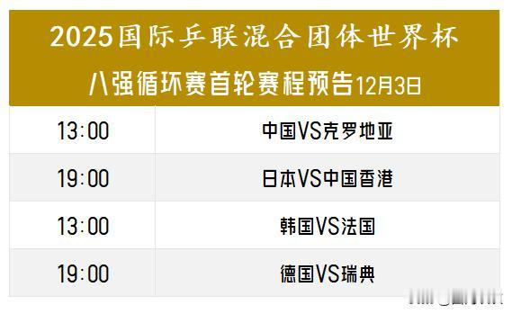 【八强循环赛明日开打!国乒首轮将战克罗地亚!】 2025国际乒联混合团体世界杯小组赛全线收官。中国、中国香港、日本、克罗地亚、韩国、瑞典、德国、法国晋级八强循环赛。 明天是八强循环赛首轮,国乒将战罗克地亚。