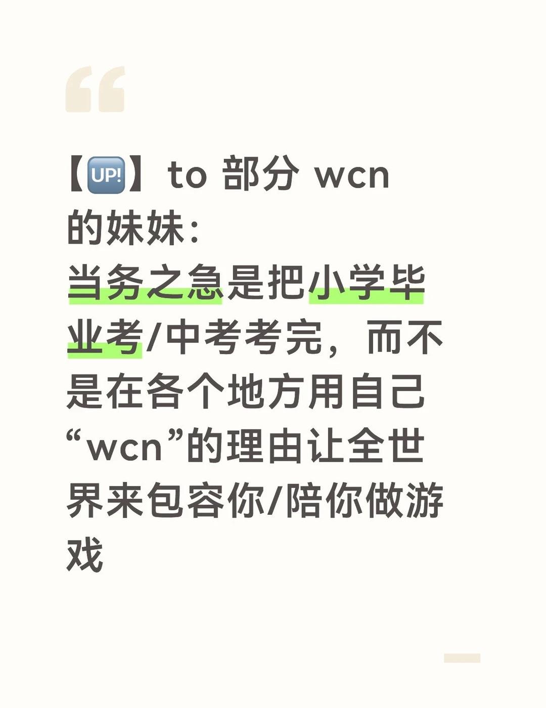 【🆙】to 部分 wcn 的妹妹: 当务之急是把小学毕业考/中考考完,而不是在各个地方用自己“wcn”的理由让全世界来包容你/陪你做游戏 zgyyj 同担