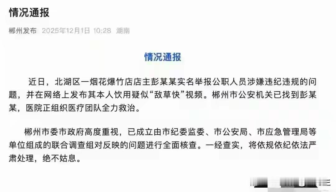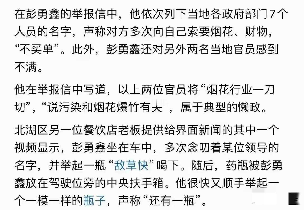 湖南烟花店老板已经去世了。 遗体已经送往了殡仪馆,医生说:中毒的剂量太大了,超过了致死量太多了。 11月30日,湖南郴州发生一起重大事故,现场车辆被炸飞,很多烟花被点燃。 这些烟花不是意外燃放,而是故意为之。 这个故意为之的就是这些烟花的主人,烟花店老板。 在这之前,这个烟花店老板在直播间直播喝农药,疑似“敌草快”。 他喝完农药,给网友们说:赶紧去华泰城看放烟花,我们下辈子见。 这个烟花店老板,就这样子离开了,留下两个儿子。 他的好朋友发文说:兄弟一路走好,下辈子我们还做兄弟,你这两个孩子,我会像自己的孩子一样照顾,让孩子健康快乐成长,正义不会缺席的,你就安息吧。 这个烟花店老板姓彭,经营烟花很多年。 他今年39岁,家中有两个年幼的儿子。 12月2日早晨六点多的时候,抢救无效去世。 家里的顶梁柱塌了。 网友说:死都不怕,还怕啥?你不想想还有两个儿子。其实再糟糕的事情总会过去,一切都是浮云,还有啥想不开的? 大家怎么看这个事情?