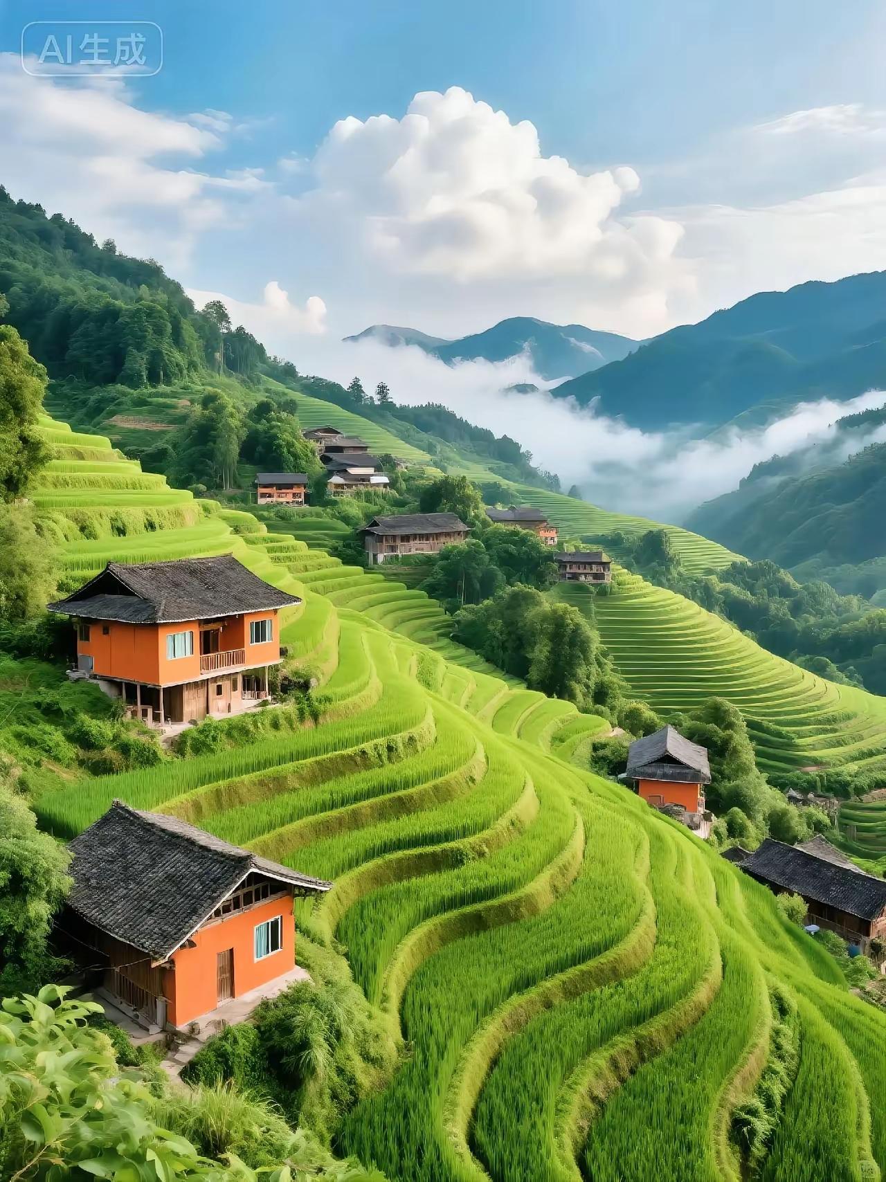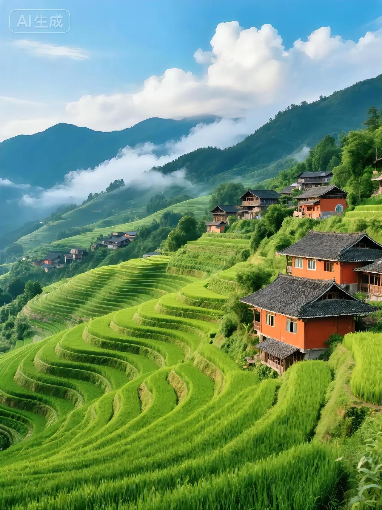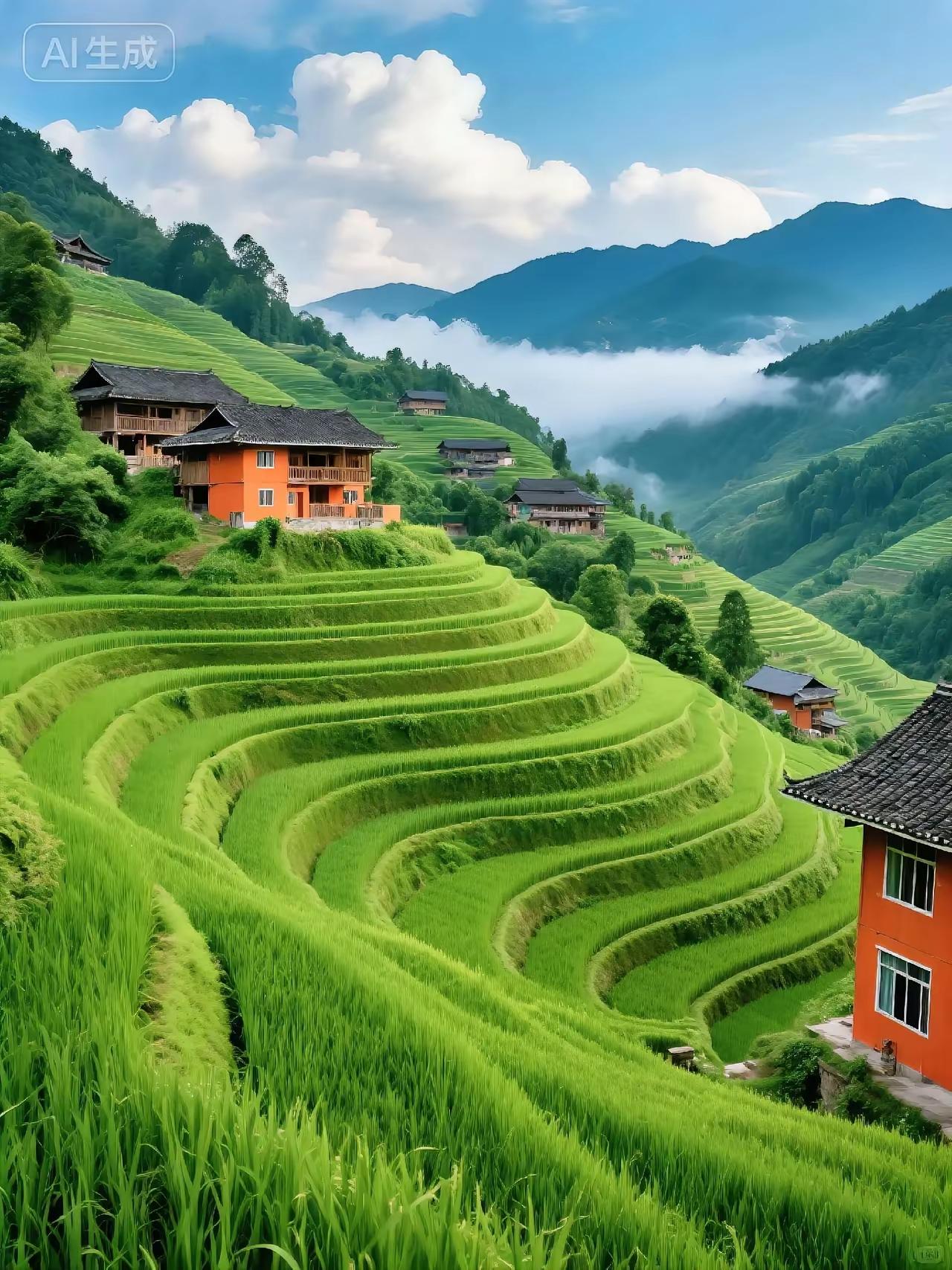 云雾缭绕的梯田间,红墙黑瓦的房屋错落有致,宛如世外桃源。