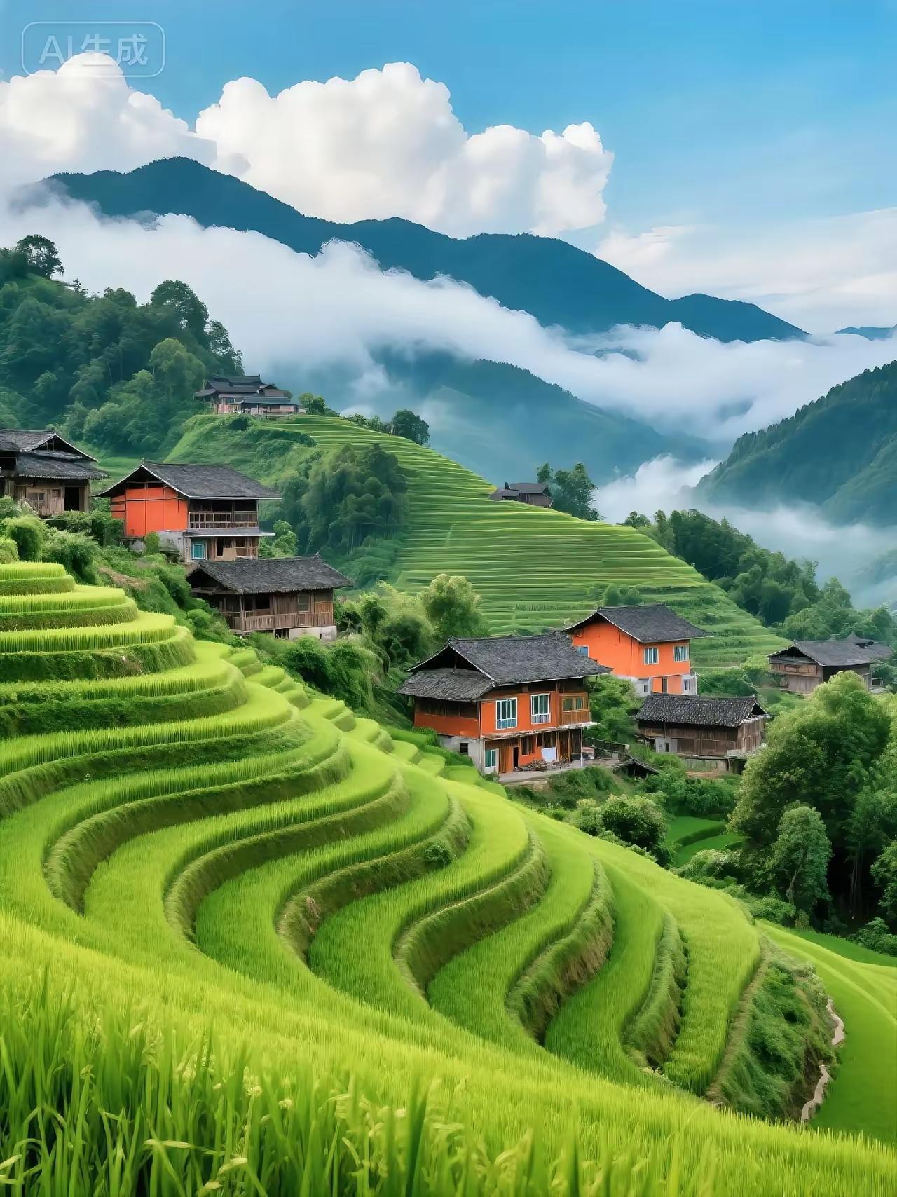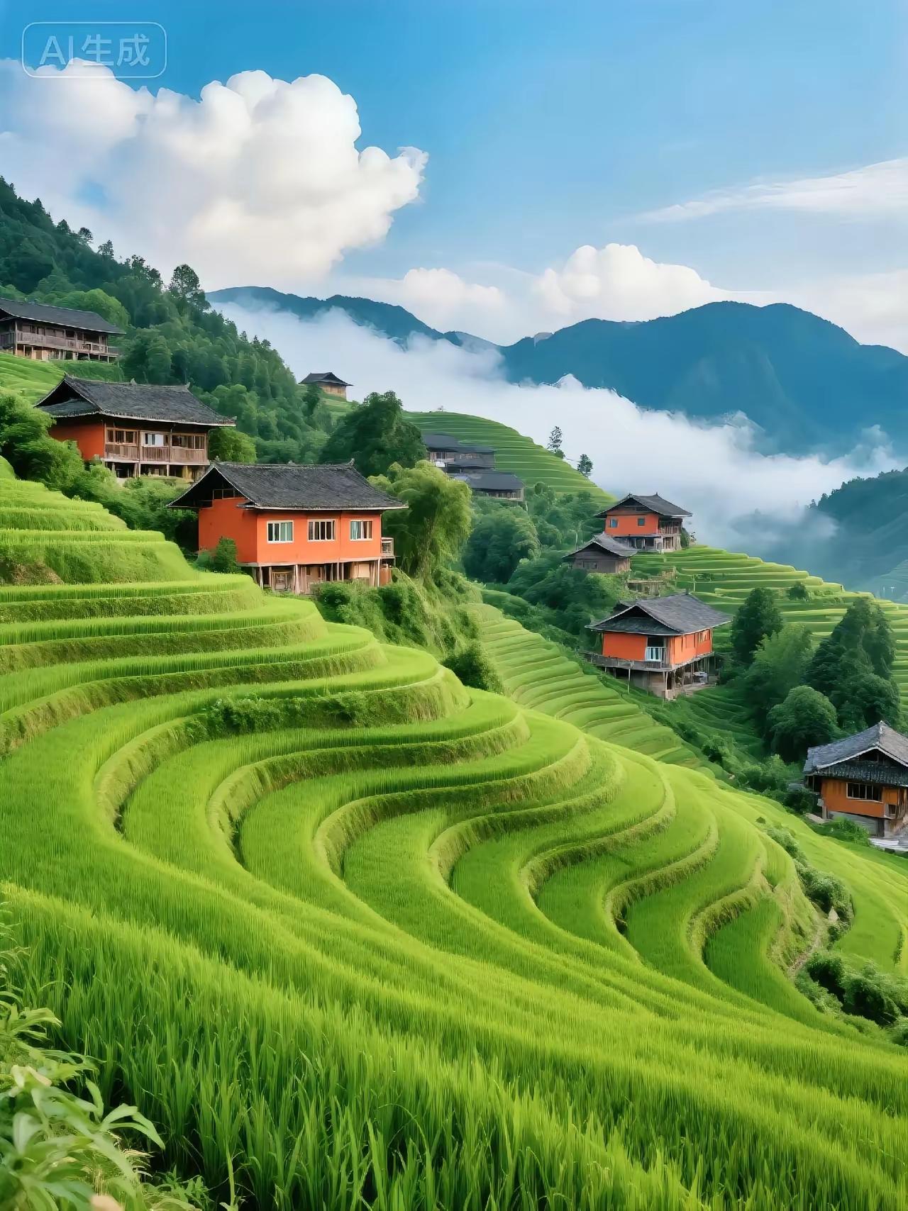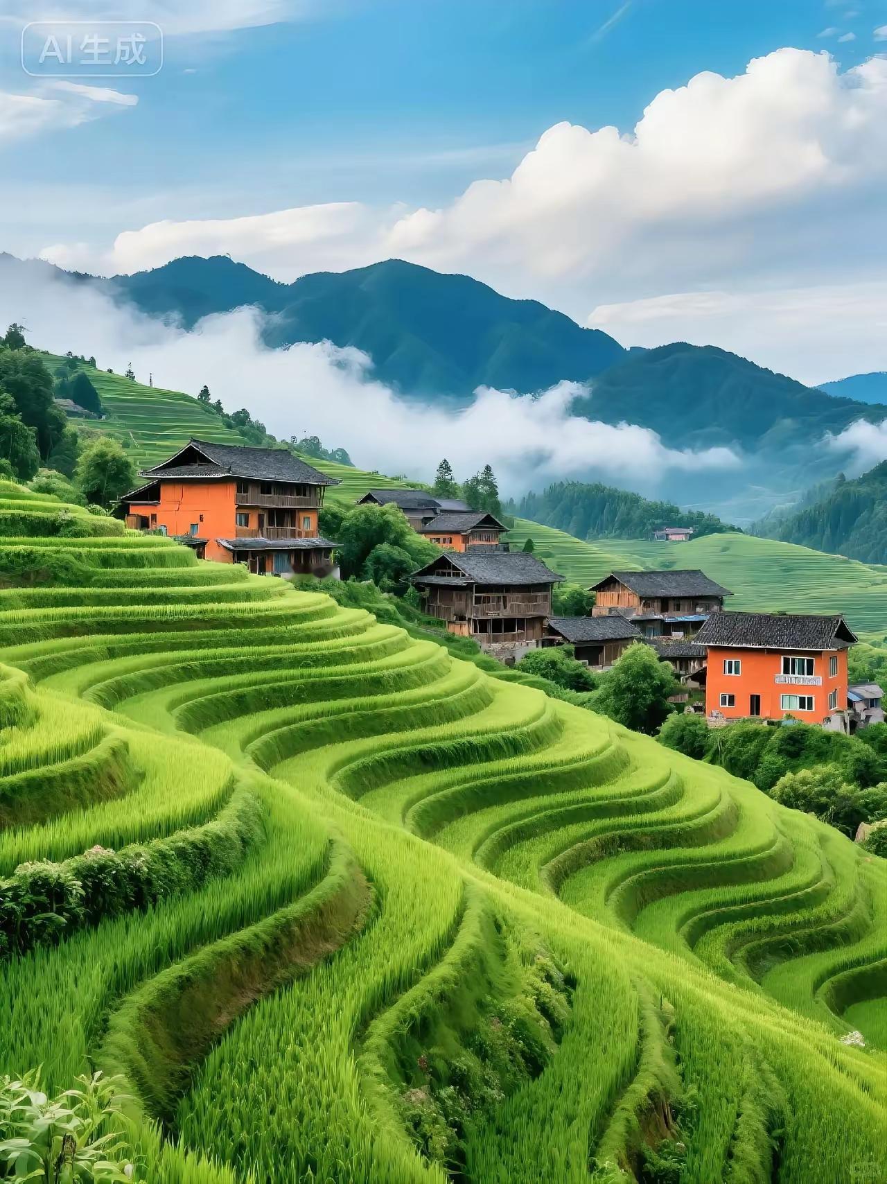 云雾缭绕的梯田间,红墙黑瓦的房屋错落有致,宛如世外桃源。