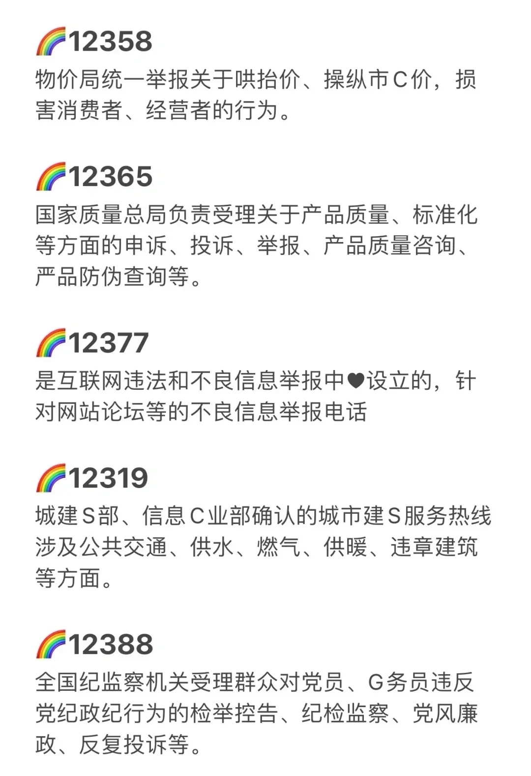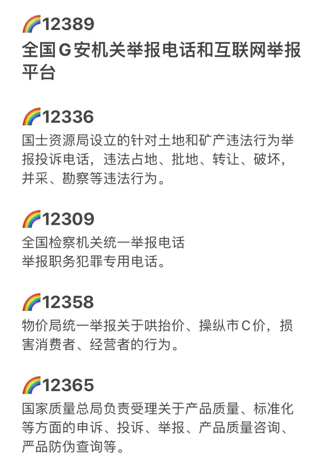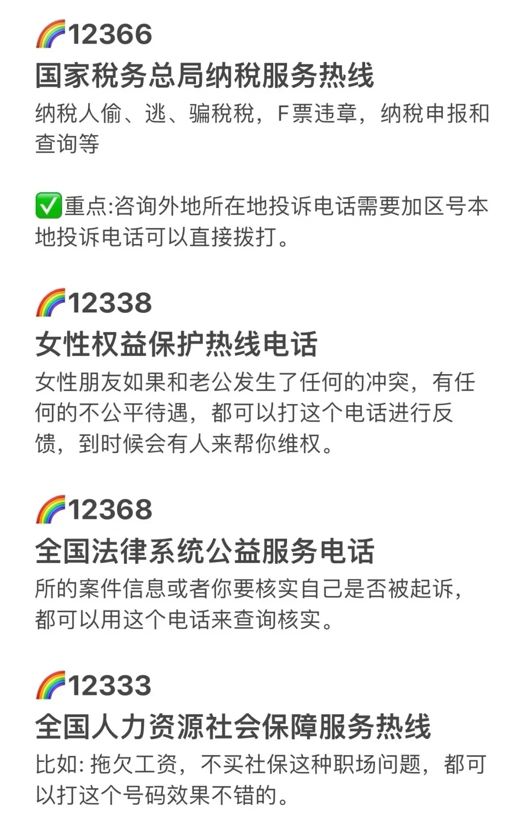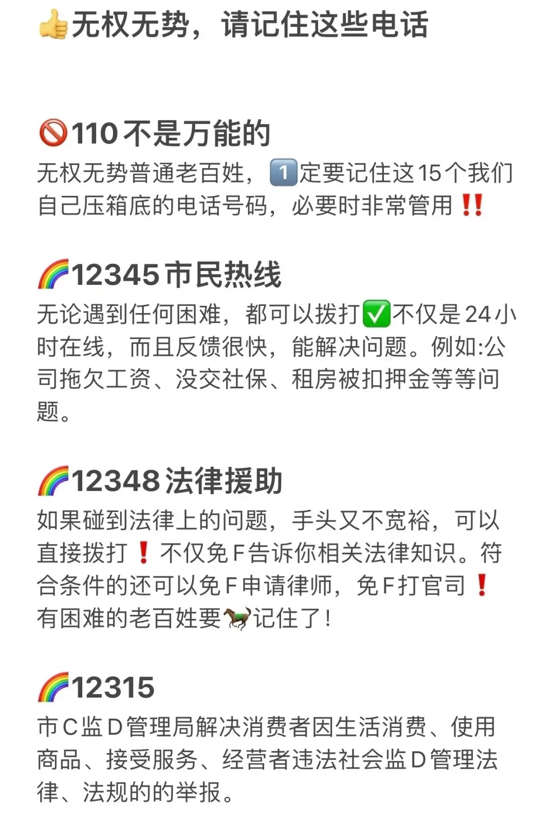 💡110不是万能的 无权无势普通老百姓,一定要记住这15个电话号码,必要时非常管用🔥🔥 🌈12345市民热线 无论遇到任何困难,都可以拨打。不仅是24小时在线,而且反馈很快,能解决问题。例如:公司拖欠工资、没交社保、租房被扣押金等等问题。 🌈12348法律援助 如果碰到法律上的问题,手头又不宽裕,可以直接拨打✅不仅免费告诉你相关法律知识。符合条件的还可以免f申请律师,免f打官司❗普通老百姓🐴住了 🌈12333 全国人力资源社会保障服务热线,比如:拖欠工zi,不买社保这种职场问题,都可以打这个号码,效果不错的。 🌈12368 全G法律系统公益服务电话 所有的案件信息或者你要核实自己是否被起诉,都可以用这个电话来查询核实。 🌈12338 女性权益保护热线电话 女性朋友如果和老公发生了任何的冲突,有任何的不公平待遇,都可以打这个电话进行反馈,到时候会有人来帮你维q