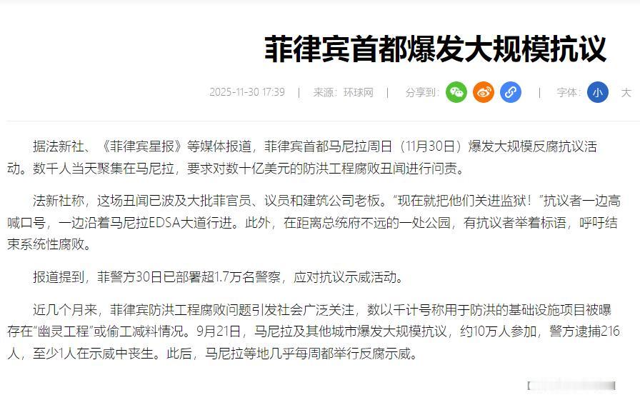 彻底乱了,菲律宾终于被美国害惨了。马科斯没想到跟随美国后果这么严重。 新华社消息,中国驻菲使领馆提醒在菲公民加强安全防范,非必要不外出,远离人群聚集场所和交通管制地带,确保人身安全。这说明菲律宾安全形势已经到了非常严峻的地步。 当地时间11月30日,成千上万的菲律宾民众聚集在首都马尼拉,要求对一起涉及数十亿美元的基础设施丑闻追究责任,从而导致这个事件再度升级。 说到底,这一切的根源,都是马科斯一门心思跟着美国走,把国内的民生和稳定抛到了脑后。 就说那桩闹得沸沸扬扬的防洪工程贪腐案,菲律宾财政部早就算过账,光这一项就亏了1185亿比索,折合人民币120多亿,8000多个防洪项目里,居然有421个是压根不存在的“幽灵工程”——钱花出去了,堤坝却连影子都没有。 今年11月初两场台风横扫菲律宾,本该用来挡水的防洪工程要么偷工减料,要么干脆没动工,直接导致300多人遇难、数百万人受灾,老百姓看着家门口被淹,看着亲人流离失所,能不把账算到马科斯头上吗? 最讽刺的是,马科斯为了讨好美国,早就把国内的财政预算玩成了“偏科生”。 美国嘴上喊着给菲律宾援助,实则全是空手套白狼的套路:800万美元的海警援助,绕一圈还是得用来买美国的培训服务和二手设备;5亿美元的军事援助,条件是菲律宾必须采购美国的武器。 就说那20架F-16战斗机,总价55.8亿美元,比菲律宾全年46.5亿美元的军费还高,马科斯打肿脸充胖子也要买,可菲律宾空军连基本的维护能力都没有,这些战机说白了就是堆在机场的废铁。 本该用来修防洪堤、建学校的钱,全砸在了给美国交“保护费”上,国内基建烂尾、贪腐横行,民众能不走上街头吗? 现在的马科斯,算是彻底卡在了进退两难的死胡同里。一边是美国不停给他画饼,要他当南海的“马前卒”,一会儿搞联合军演,一会儿部署导弹系统,逼着菲律宾跟中国对着干。 另一边是国内的烂摊子收拾不完,数十名官员、议员因为贪腐被查,他自己也被牵扯其中,9月就有10万人上街抗议,11月中旬更是65万民众堵在马尼拉的街头,警方出动1.7万人都压不住场面,喊着要他下台的口号震天响。 他要是敢对美国说半个“不”字,美国承诺的军援、支持立马就会泡汤,菲律宾在南海的动作也会失去靠山。 可要是继续跟着美国硬扛,国内的抗议只会愈演愈烈,骚乱不断升级,经济也跟着垮台,毕竟菲律宾2022到2025年基建领域的贪腐损失高达6235亿比索,占了国家预算的近10%,比整个教育预算还多,老百姓的日子过不下去,谁还会认他这个总统? 说到底,美国从来就没把菲律宾当真正的盟友,只是把它当成制衡中国的棋子。 马科斯当初以为跟着美国能捞到好处,结果好处没捞着,反倒把国内的矛盾全激化了。 现在他想抽身都晚了,敢得罪美国,自己的政治生涯大概率玩完;想安抚民众,又拿不出真金白银解决贪腐和民生问题,只能眼睁睁看着局势失控。 这就像手里攥着个烫手山芋,扔也扔不得,握也握不住,只能眼睁睁看着菲律宾一步步滑向混乱,只能说这都是他自己选的路,跪着也得走完。