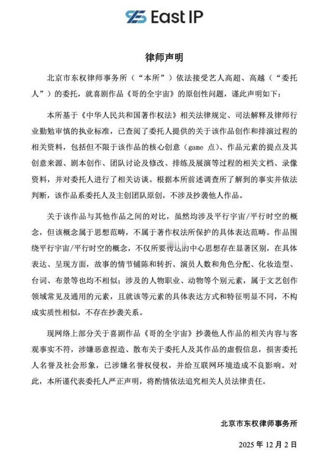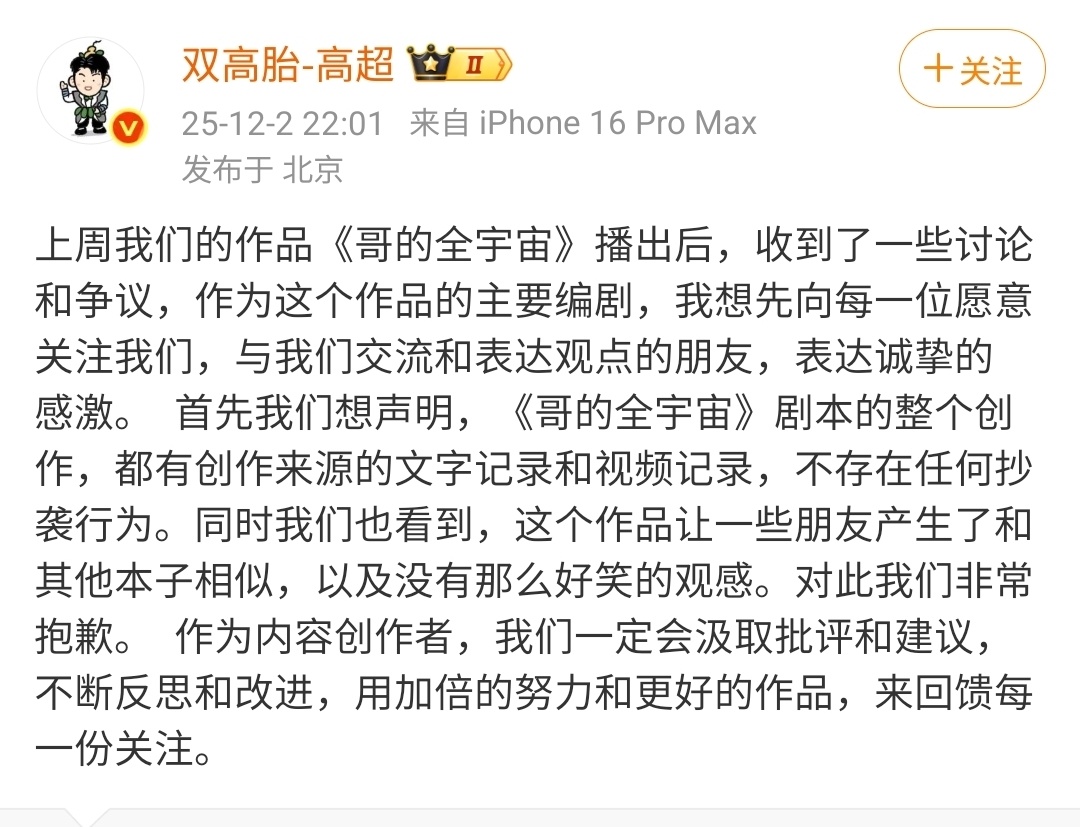 双高胎抄袭双胞胎喜剧组合双高胎回应抄袭,聘请律师发布律师函否认在喜人奇妙夜2中的作品《哥的全宇宙》抄袭《一年一度喜剧大赛》中的平行时空饭店。按照律师的说法,虽然两部作品存在设定雷同,并且都是以平行时空为框架,再加上结局都是回归珍惜当下的主旨但是双高胎律师认为,哥的全宇宙创作属于演员的真实经历。律师在查阅了所有的创作过程和相关资料之后,确定双高胎团队作品是原创。平行宇宙只是一个观点,不受著作权保护,并且在作品角色分配和台词上都不相似。双高胎抄袭