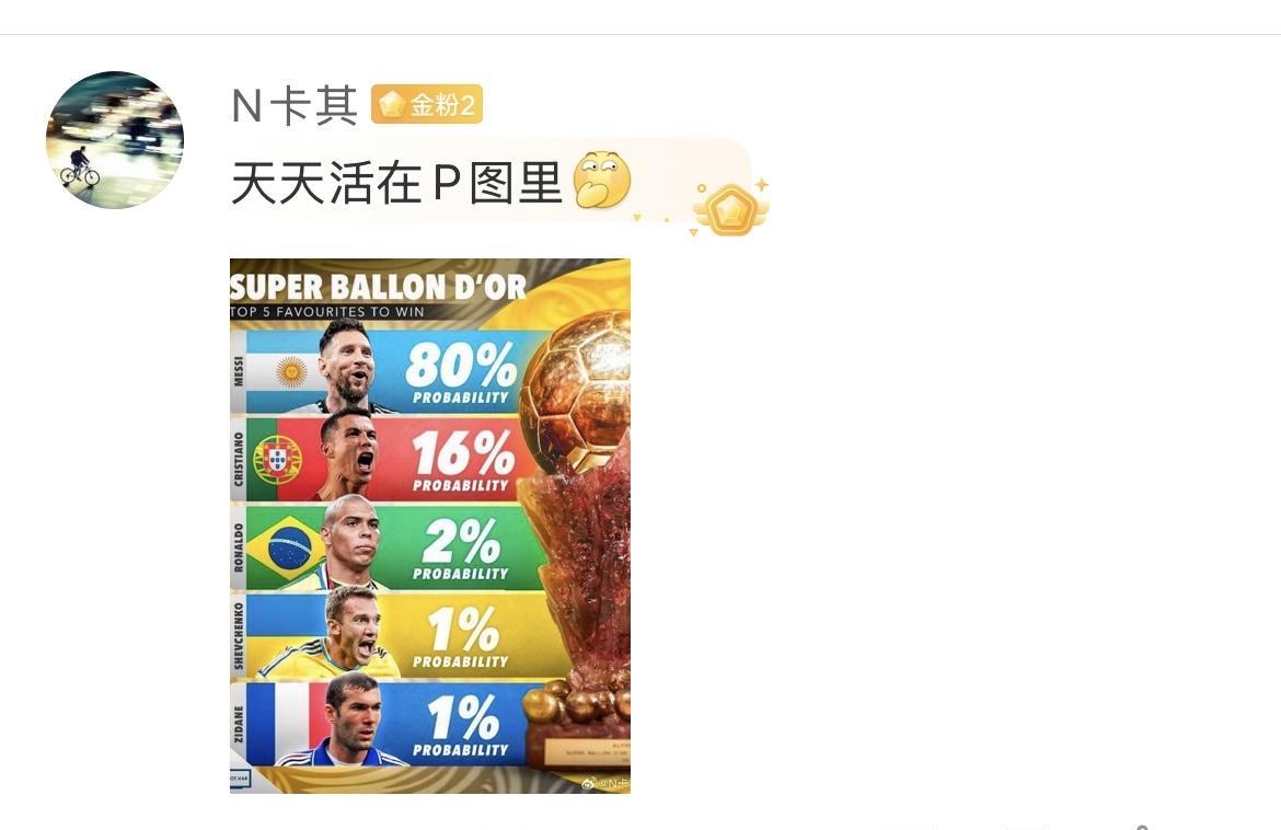 C罗粉丝:我罗是超级金球奖的热门人选。 话音刚落,就被人戳穿:天天活在P图里。人家还附上了真图,梅西80%的概率领先。
