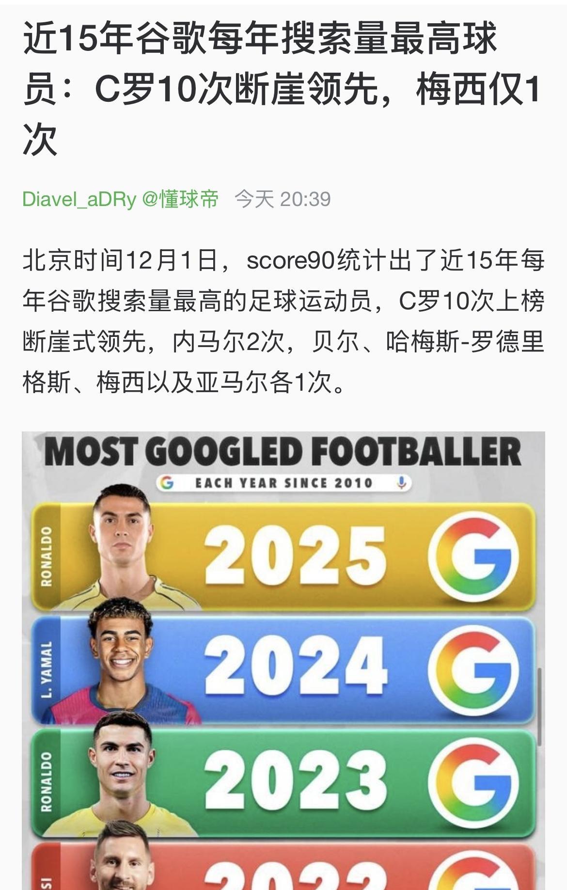 score90统计出了近15年每年谷歌搜索量最高的足球运动员,C罗10次上榜断崖式领先,内马尔2次,梅西仅1次。 球迷嘲讽道:什么时候球员不比场上表现,不比夺冠次数,反而要比搜索次数了,还断崖式领先,想笑死谁呢。 更有人直言:如果有人搜索"ronaldo",算在C罗身上还是大罗身上?
