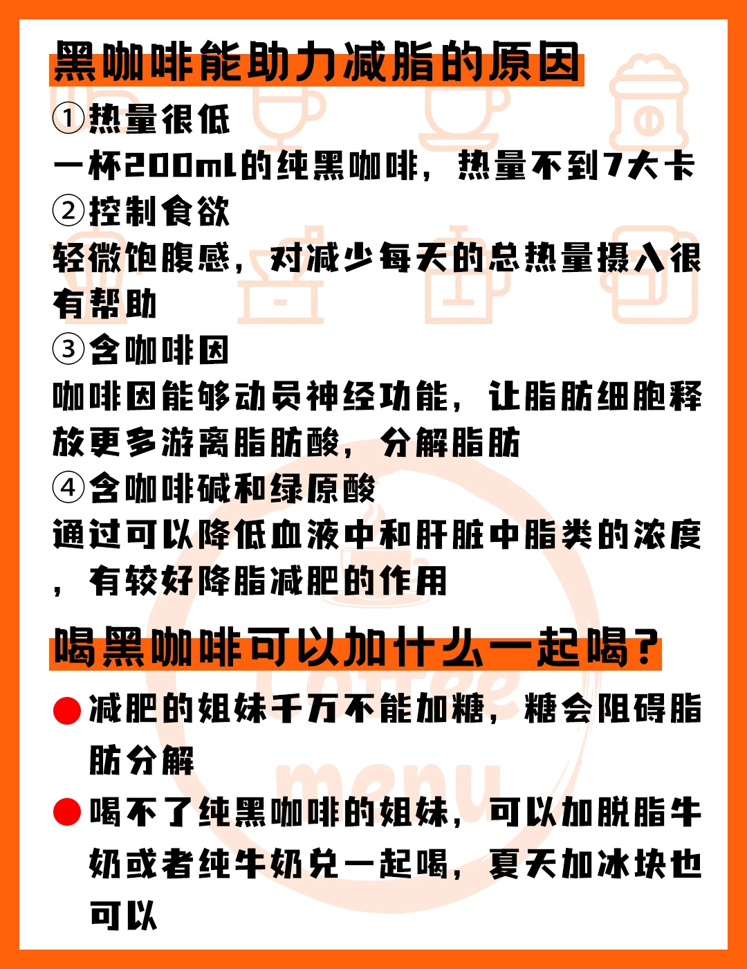 1.早餐喝:热的黑咖啡效果比冷的好